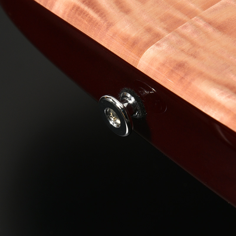 “Red Collection”に合わせて製作された本機のカラーリングは、Vintage Wine Redと名付けられました。文字通り年代物のビンテージワインを思わせる、くすみを帯びた味わい深い赤を表現しています。マッチングカラーのアクリルピックガードとの組合せにより、ギター全体を通して美しい赤の表現を目指しました。