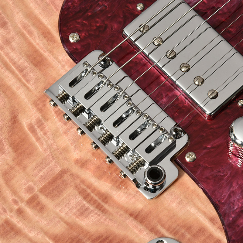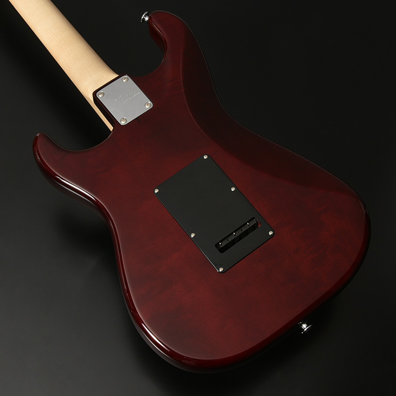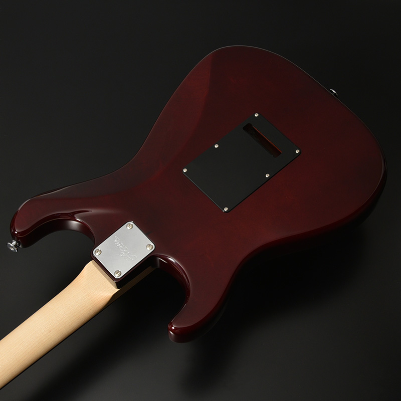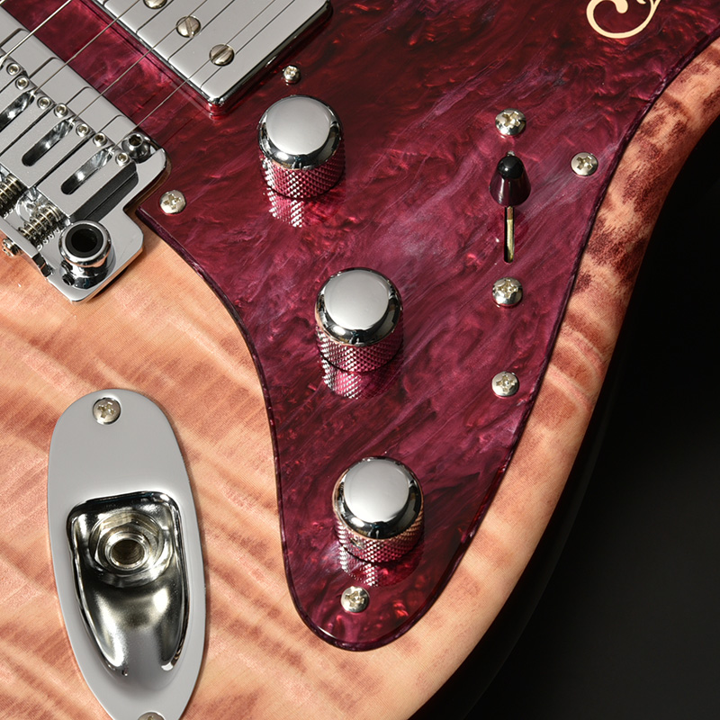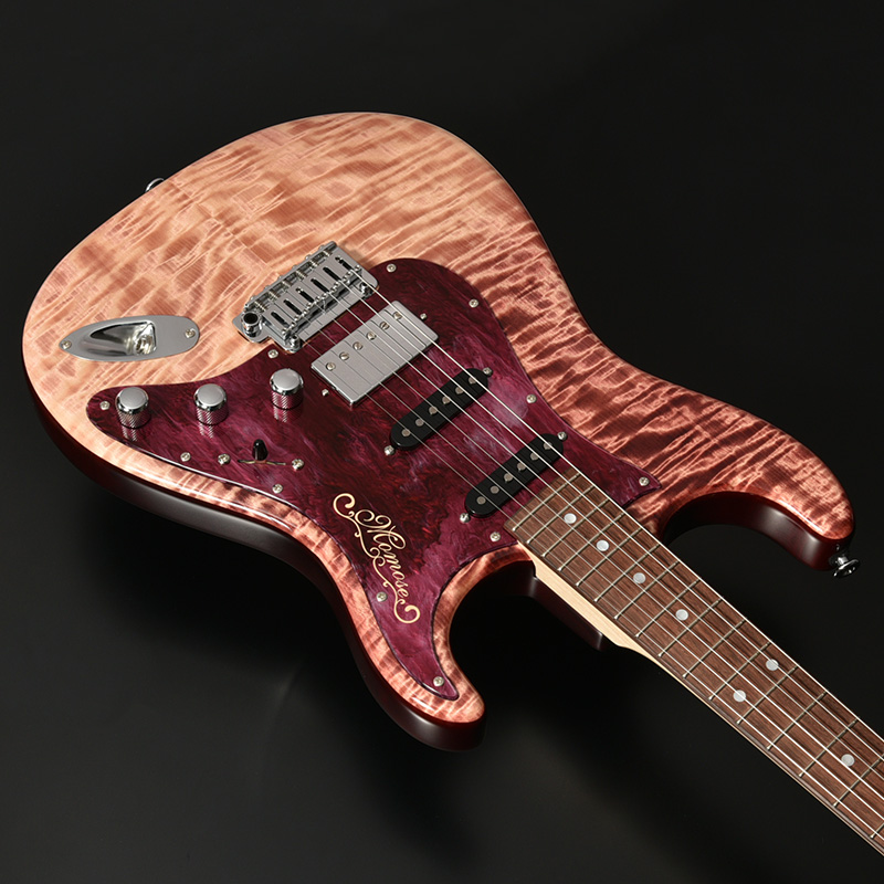 和材として人気の高いトチ材をボディに使用した一本です。トップ材には美しいフレイム杢目を有した個体を選定し、バック材にも同じくトチを採用しています。中~高音域に特徴のある抜けの良いサウンドを持ち、オーバードライブをかけた際の歪の乗りも非常に良く、その音響特性を発揮して様々なジャンルに対応可能です。