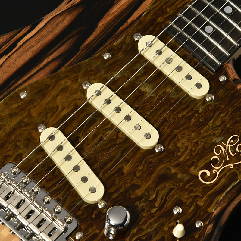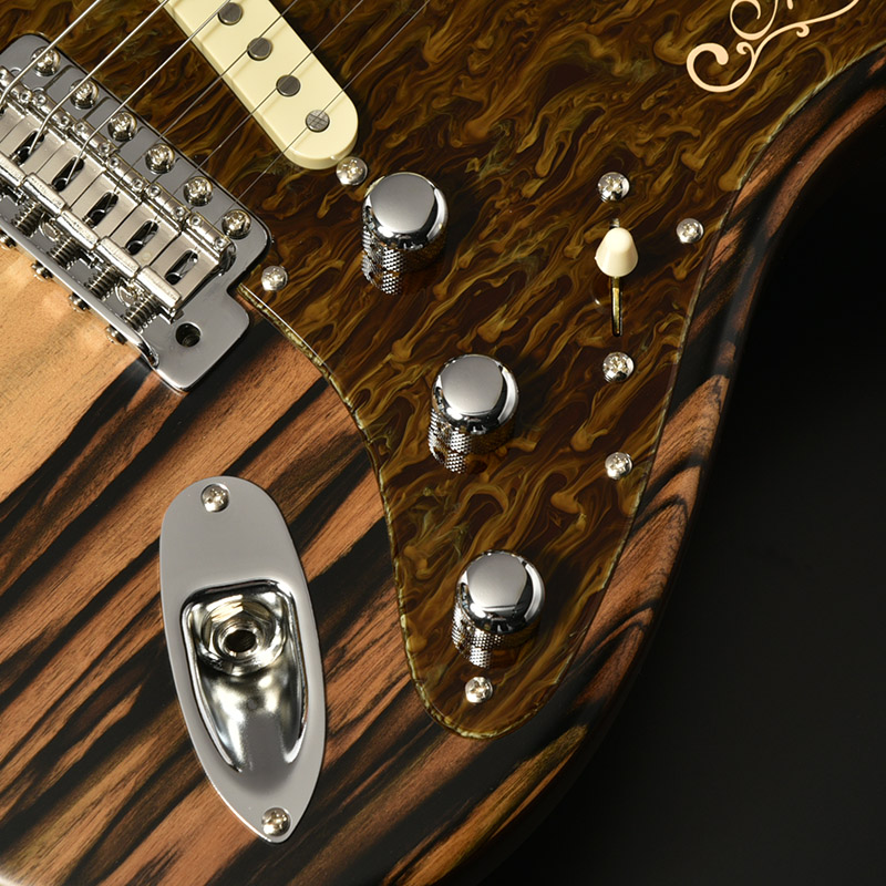 木々各々の個体が持つ杢目により、すでに2本とない見た目であることはもちろんですが、本ラインナップでは異なるカラーリングやピックガードの組み合わせによって、世界にたった1つの楽器としてお楽しみいただけます。