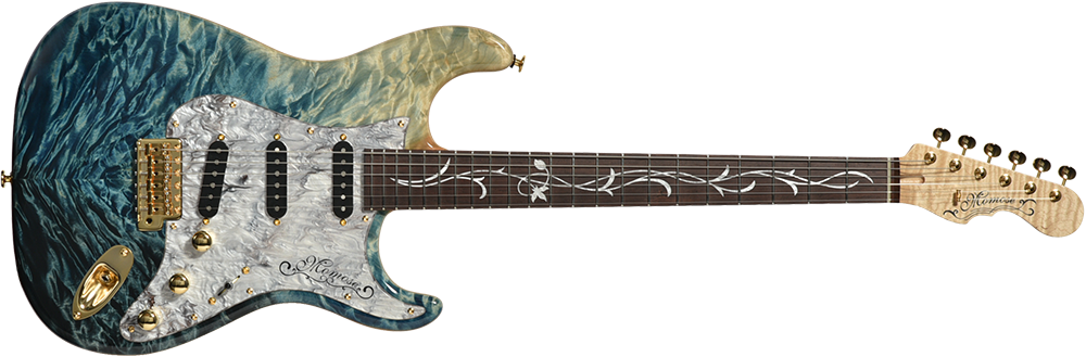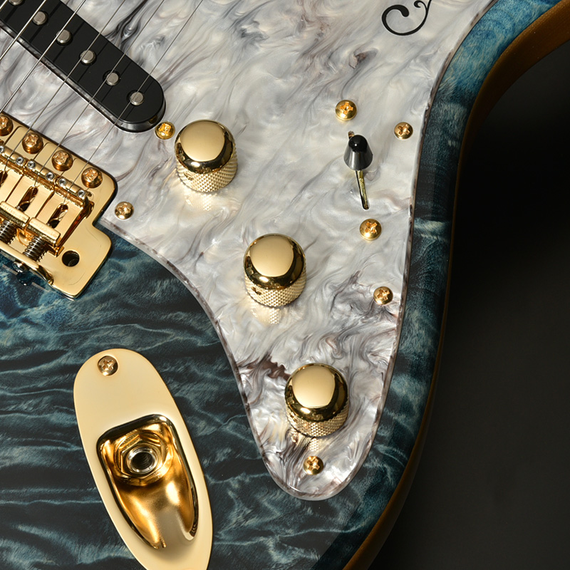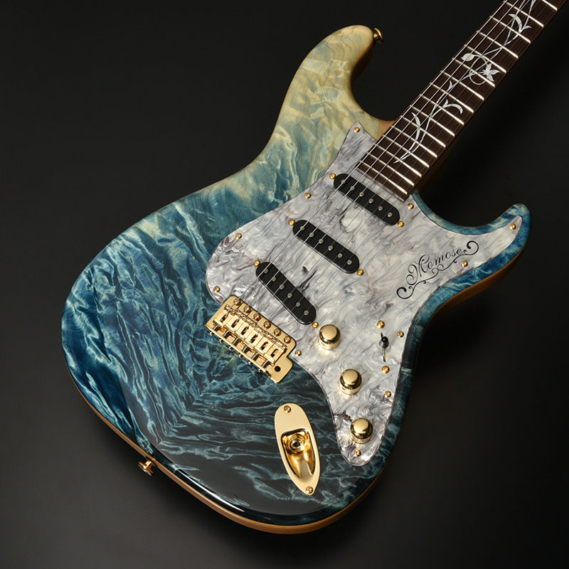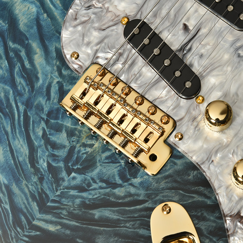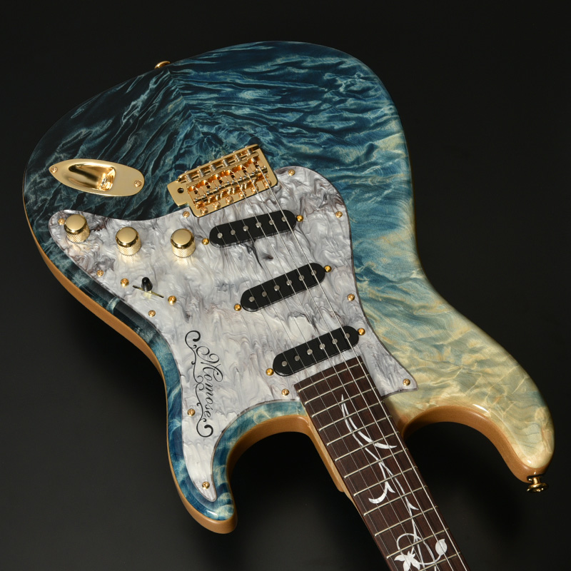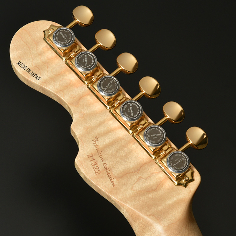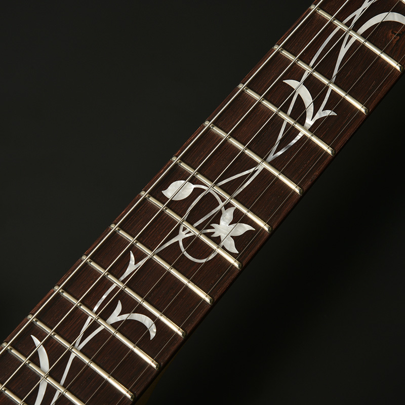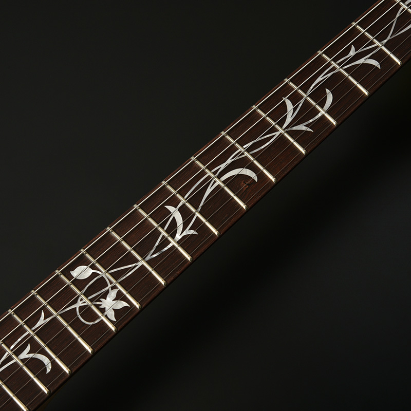 ツリーオブライフのインレイが施された指板には、近年のその需要に対して希少性を増しているマダガスカルローズウッドを採用。レギュラー製品では採用を終了しており、本数限定製作のショーモデルだからこそ実現した仕様となります。ネック材のフレイムメイプルは、ヘッドストックの先端までストライプの入ったハイグレードな個体を厳選。芸術的なルックスをぜひその目でお確かめください。