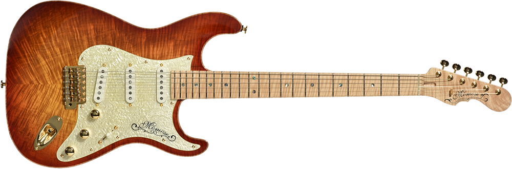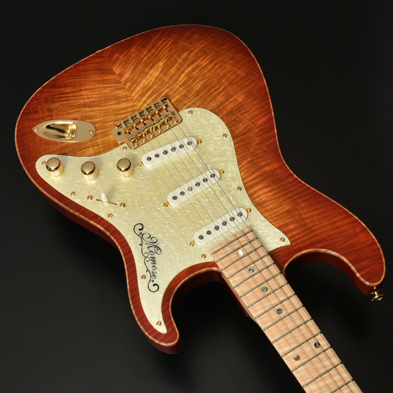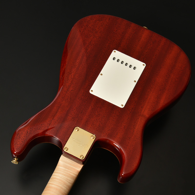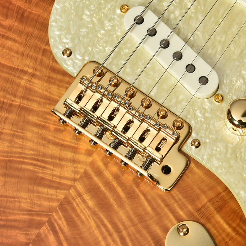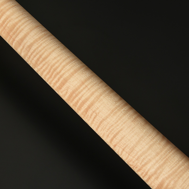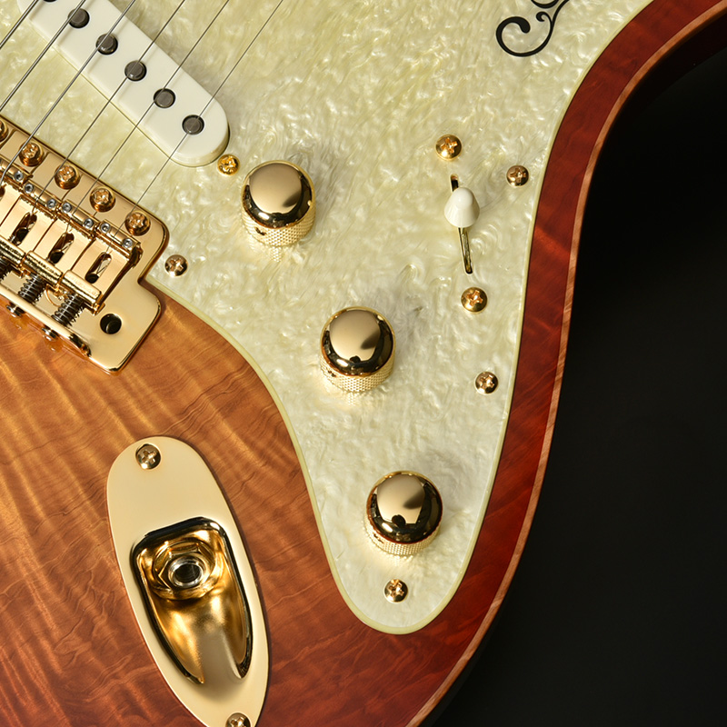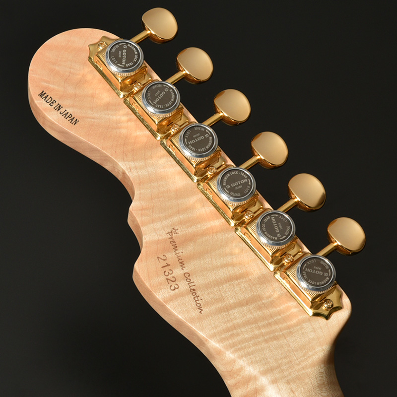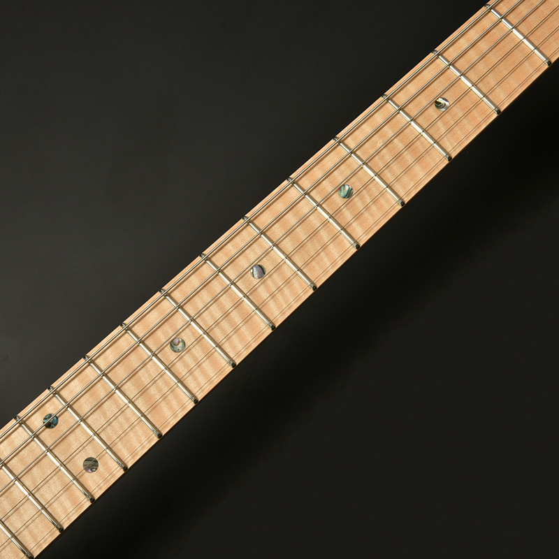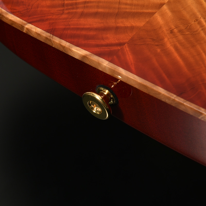 飛鳥工場の木材ストックより厳選された、ハイグレードのフレイムメイプルを指板とネックに使用。プレミアムモデルの象徴ともいえるゴージャスなルックスがプレイヤーの手元を華やかに彩ります。