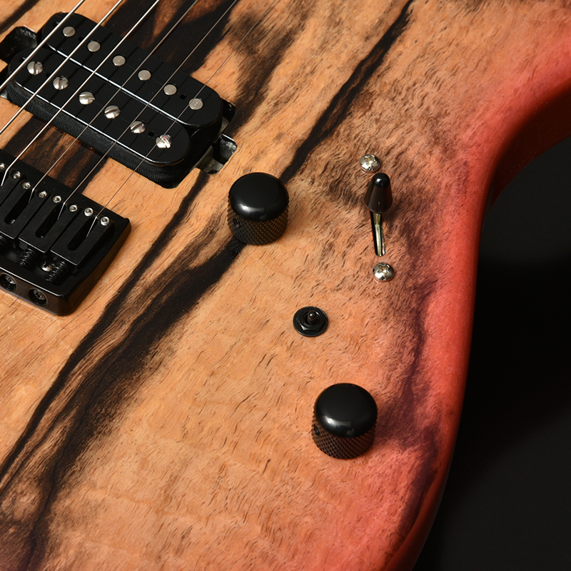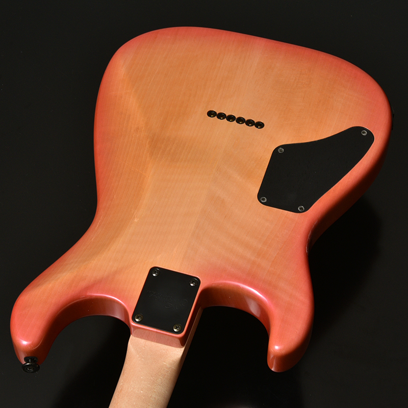クリア塗装で仕上げることが多い黒柿に珍しいパールメタリックのピンクバーストを施しております。中央のクリア部にもパール粒子を薄く混ぜボディ全体を華やかに仕上げております。