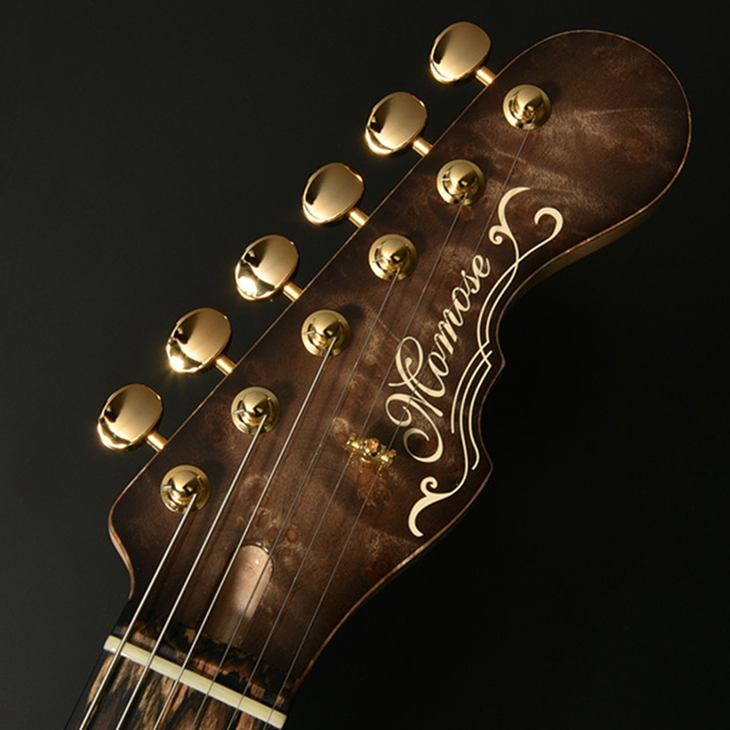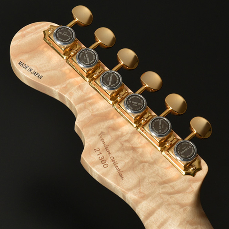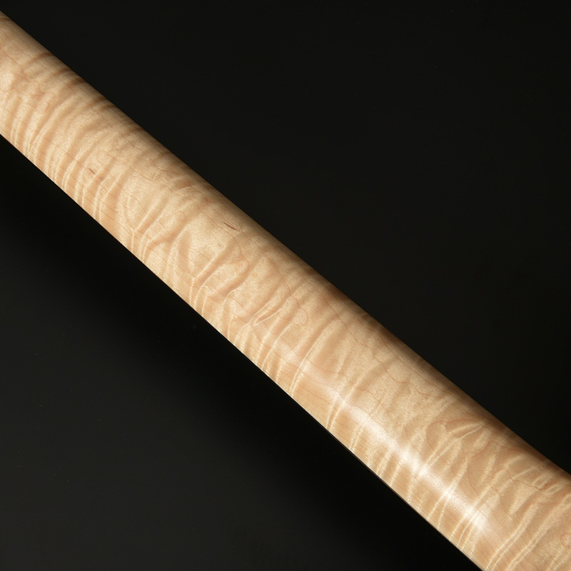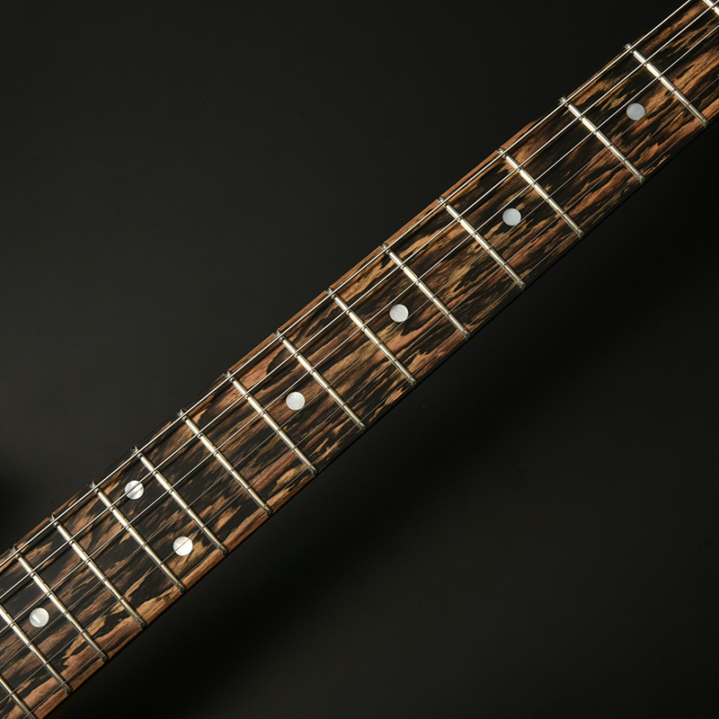 指板材にはペールムーンエボニーを使用。定番のローズウッドなどに比べて重量があり、音の立ち上がりが早く輪郭のあるトーンと伸びやかなサスティーンを生み出します。ネック材のフレイムメイプルは、ヘッドストックの先端までストライプの入ったハイグレードな個体を厳選。芸術的なルックスをぜひその目でお確かめください。