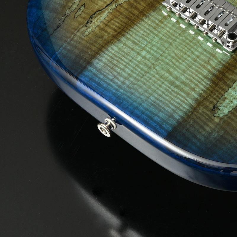 スポルテットメイプルトップでMojotone ピックアップをSSHにレイアウトしたMCモデル。ピックガードを無くすことでスポルテットメイプルの美しさをより引き立たせています。