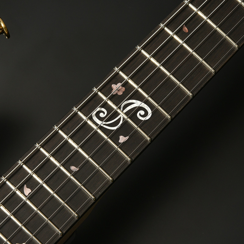 桜材をボディトップに採用した限定モデルが「ギタラバTOKYO2025」に登場!硬質で密度の高い桜材はハイミッド〜ハイに特性を持ち、演奏時にアタックと芯のある明瞭なサウンドを発揮します。音の粒立ちにも優れており、コードストロークやカッティングでも音の分離感が高く、輪郭のはっきりしたトーンが得られます。