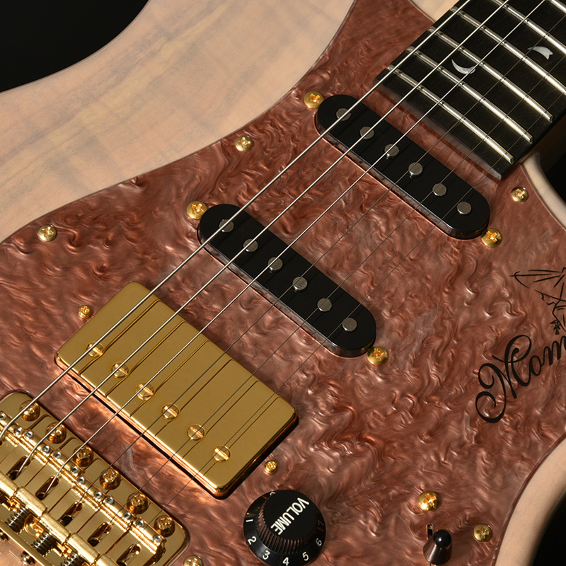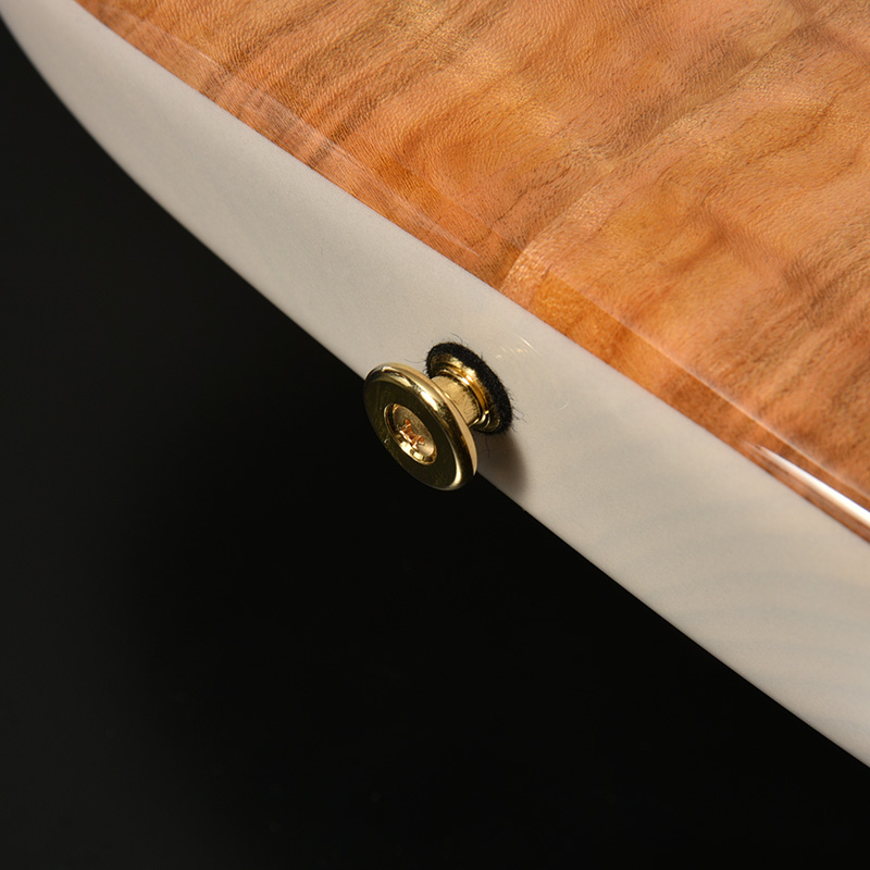そして本モデルのボディトップには、花見などでも特に馴染み深い品種の「ソメイヨシノ」を使用。桜材らしいやや赤みのある材の色味とソメイヨシノでここまで杢が出ることも珍しい、個性豊かなフレイム杢が存分に出た材です。