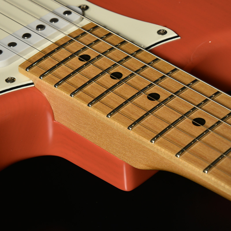 トラディショナルなSTスタイルを継承しつつも、Momose独自にブラッシュアップしたオリジナルモデル”MC”。飛鳥工場の職人により、木工から塗装、組み込みまで一本一本手作業にて仕上げられました。その丁寧な作りから生まれるプレイアビリティの高さは、多くのトッププレイヤー達からも評価されており、Momoseブランドの確かなクオリティを体現します。”MC1/R”では、アルダーボディとローズウッド指板のコンビネーションを採用しています。