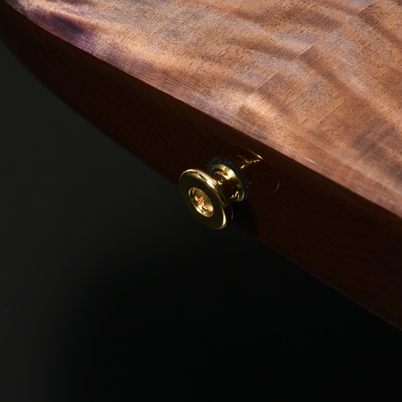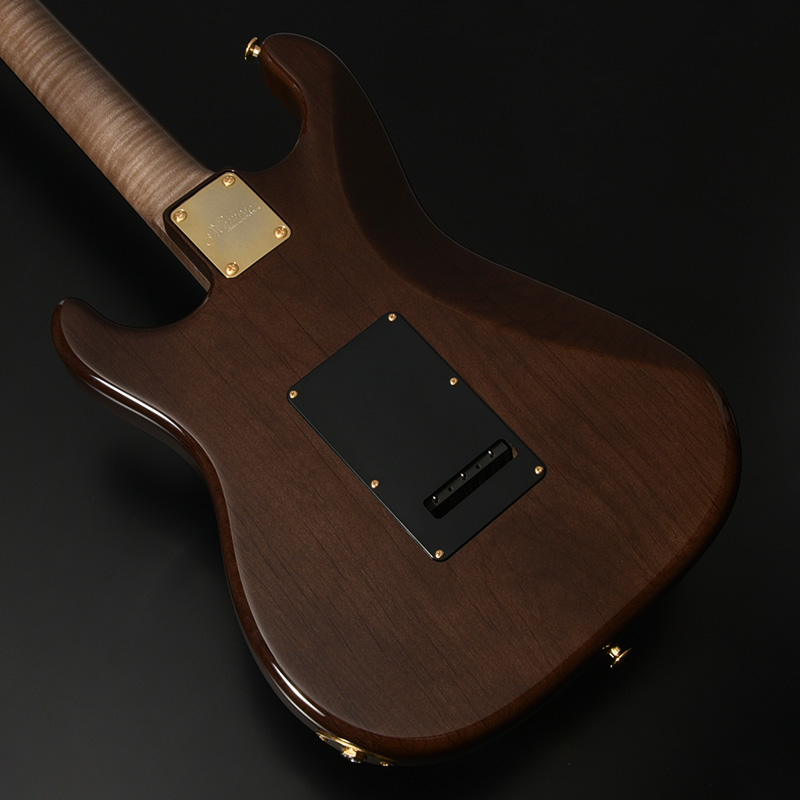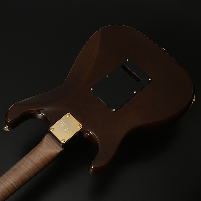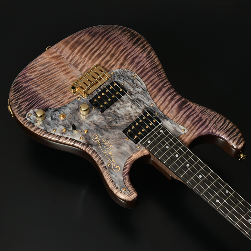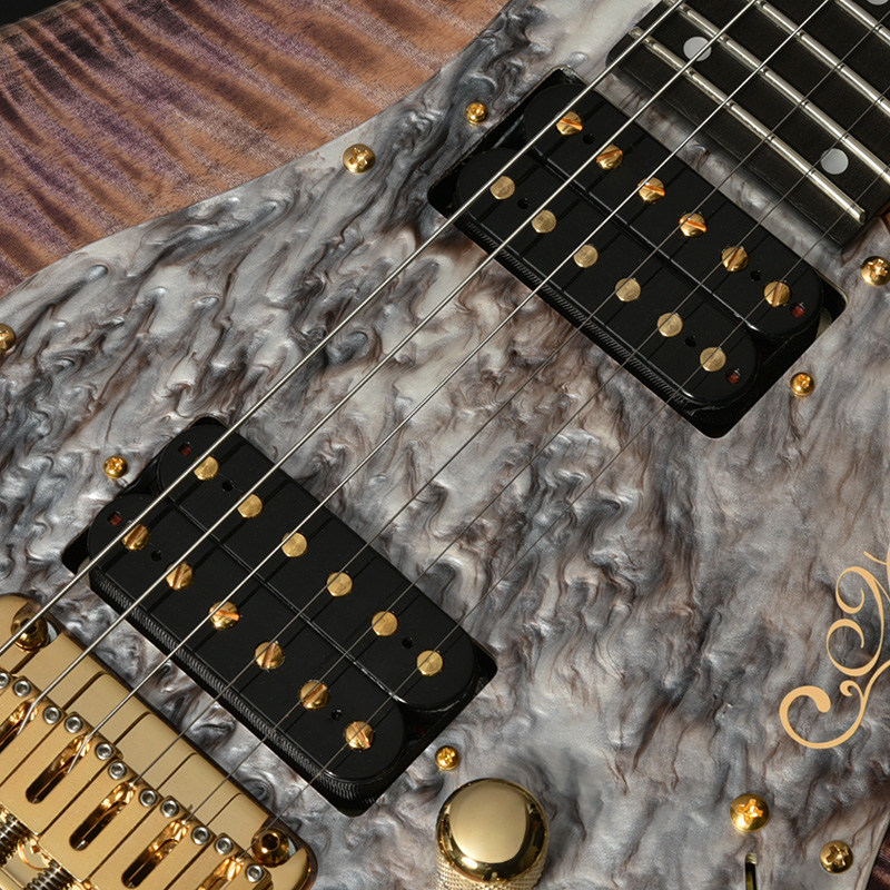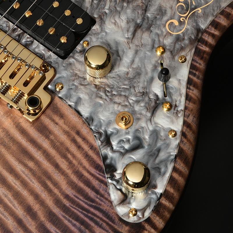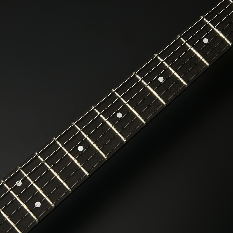 指板には黒々とした高級感のあるルックスでおなじみのエボニー材を採用。定番のローズウッドなどに比べて重量があり、立ち上がりが早く輪郭のあるトーンと伸びやかなサスティーンを生み出します。ネック材の柾目フレイムメイプルは、ヘッドストックの先端までストライプの入ったハイグレードな個体を厳選。芸術的なルックスをぜひその目でお確かめください。