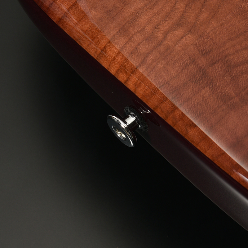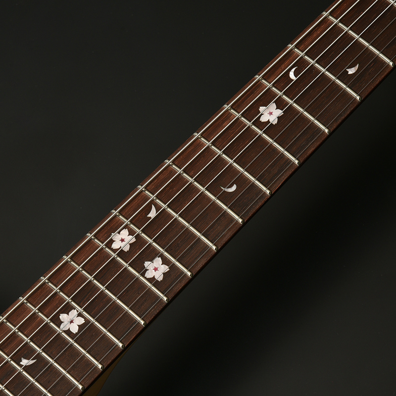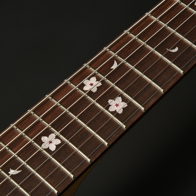 指板上のインレイには花を大きく開いた桜の花びらと散りゆく花をデザイン。天然貝が持つ色合いにより、ひとつひとつ異なる桜の表情をお楽しみいただけます。