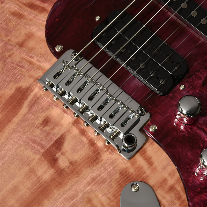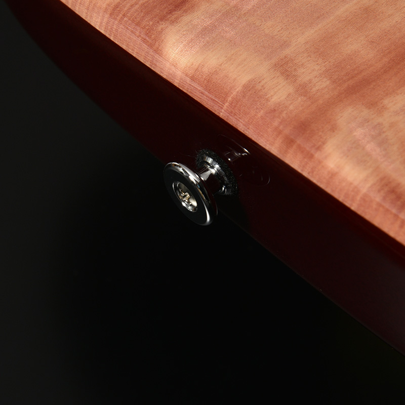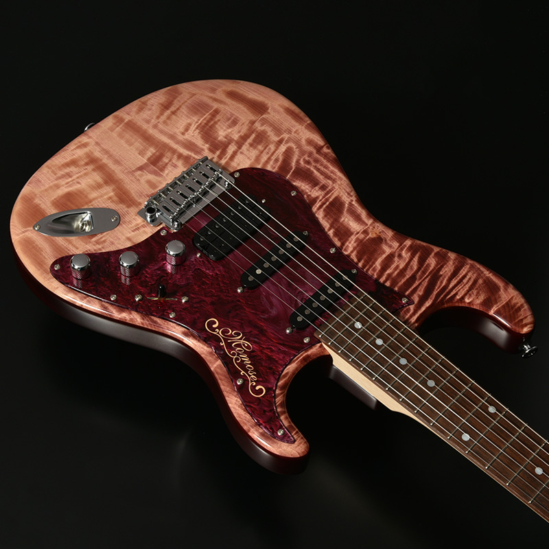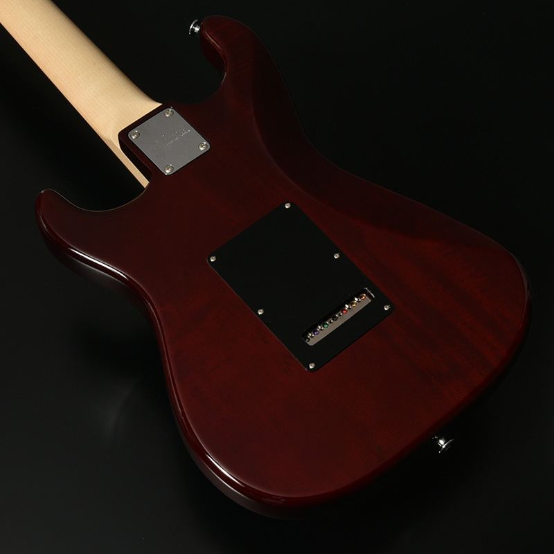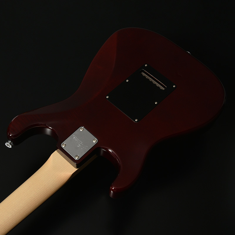 和材として人気の高いトチ材をボディに使用した一本です。トップ材には美しいフレイム杢目を有した個体を選定し、バック材にも同じくトチを採用しています。中~高音域に特徴のある抜けの良いサウンドを持ち、オーバードライブをかけた際の歪の乗りも非常に良く、その音響特性を発揮して様々なジャンルに対応可能です。