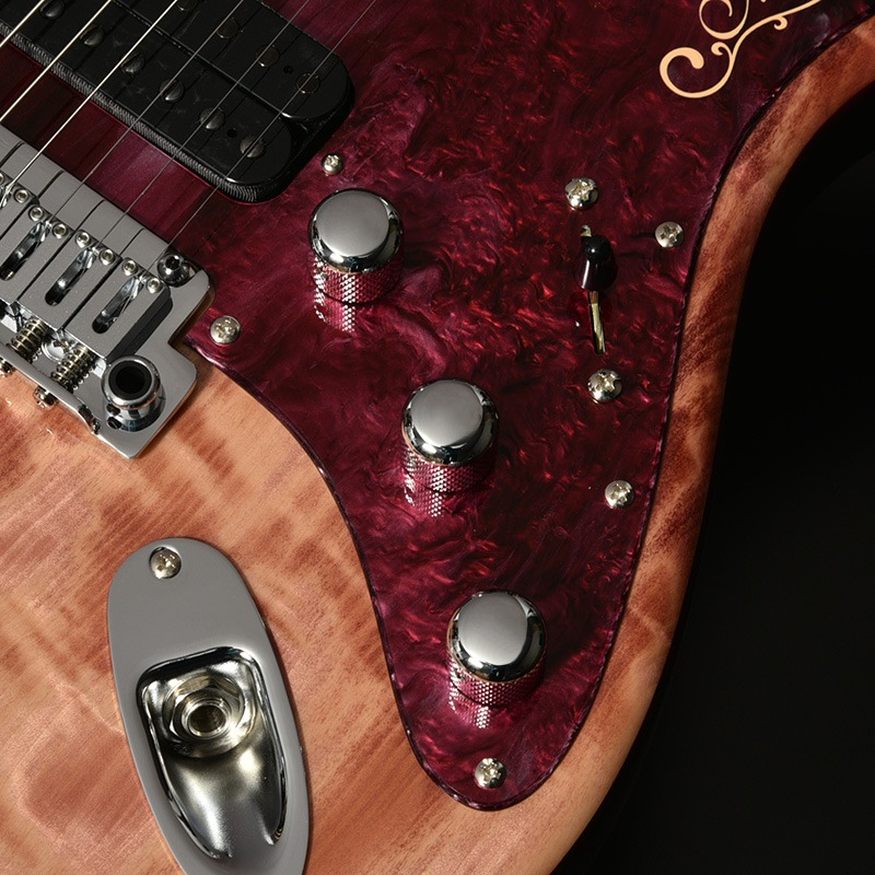 “Red Collection”に合わせて製作された本機のカラーリングは、Vintage Wine Redと名付けられました。文字通り年代物のビンテージワインを思わせる、くすみを帯びた味わい深い赤を表現しています。マッチングカラーのアクリルピックガードとの組合せにより、ギター全体を通して美しい赤の表現を目指しました。