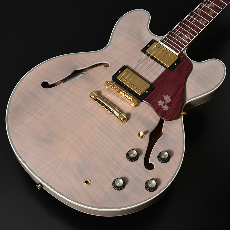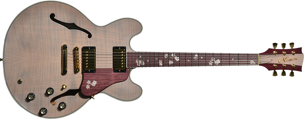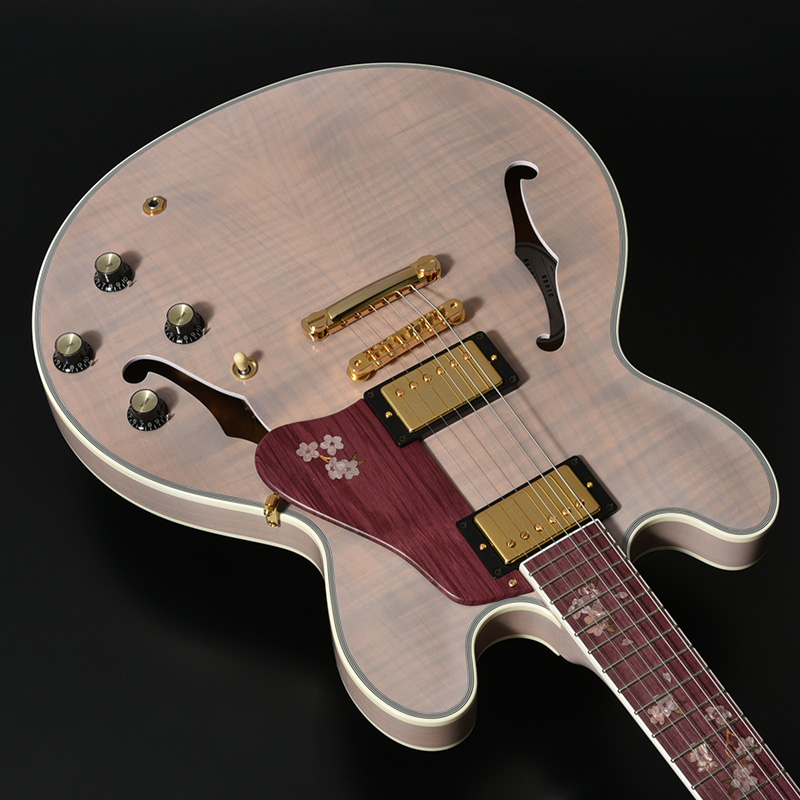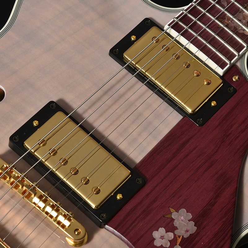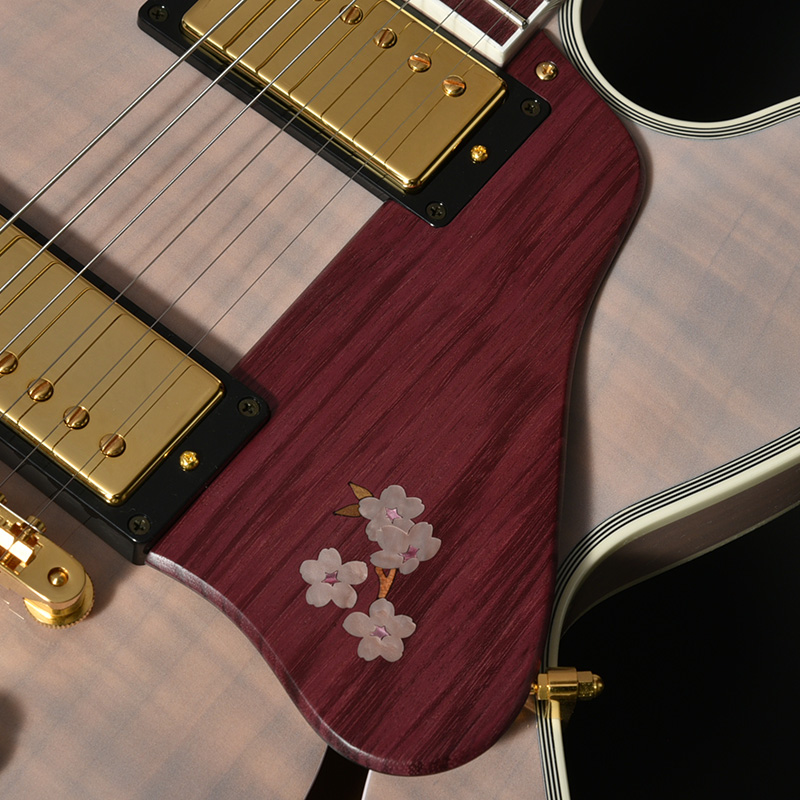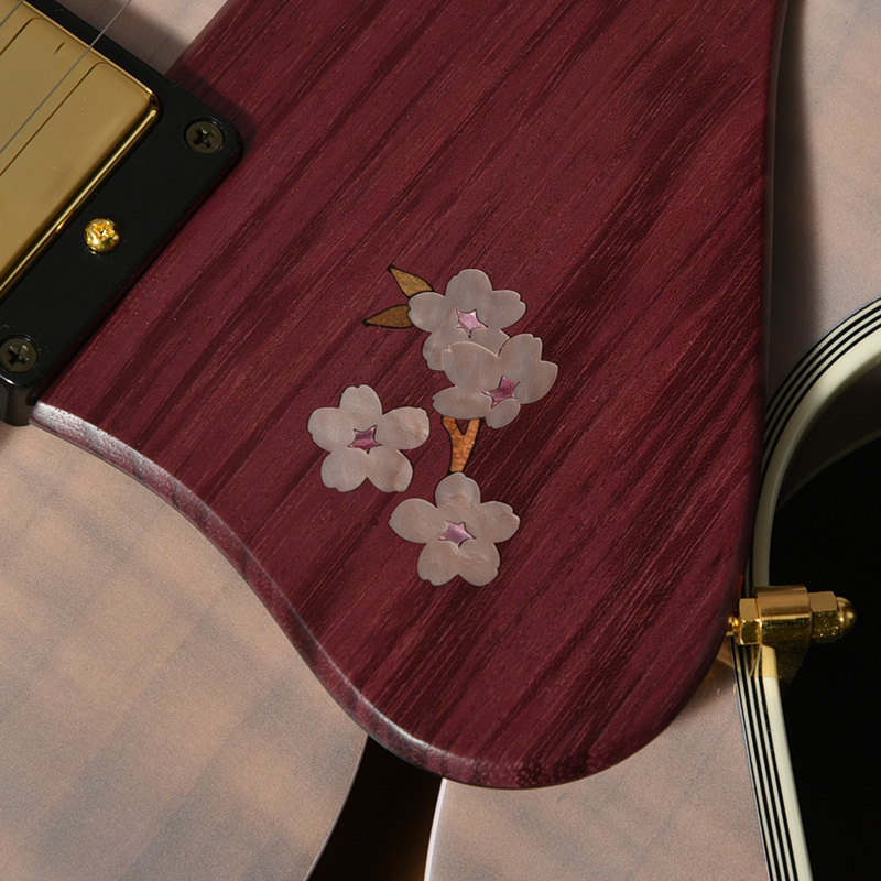 和材の中でも人気No1を誇る桜をコンセプトにした使用した、特別仕様のMESモデルです。美しいフレイム杢の現れた桜材をボディ全体に使用し、視覚的にもサウンド面にも桜の魅力を詰め込みました。木材としては程よい硬さを持つことで知られる桜材。その甘くメロウなトーンとホロウボディとの組み合わせが、和材の魅力を新たなるステージに引き上げます。