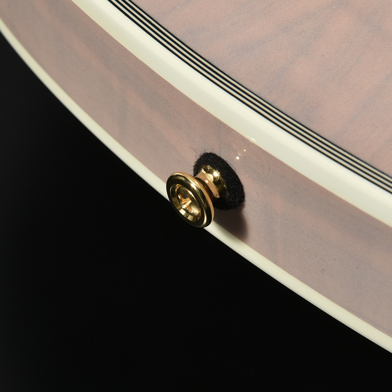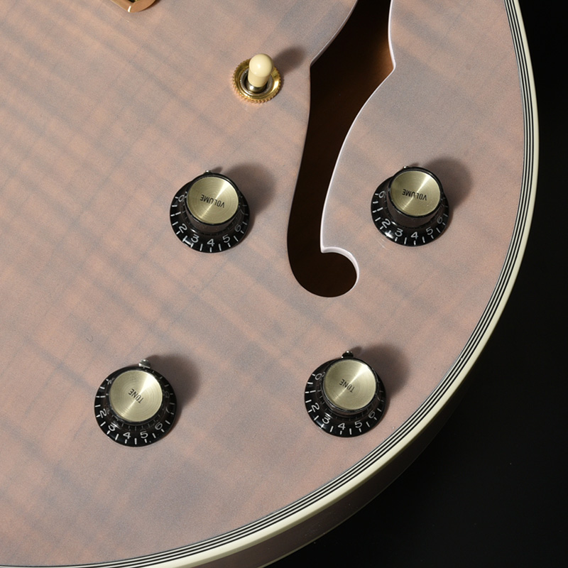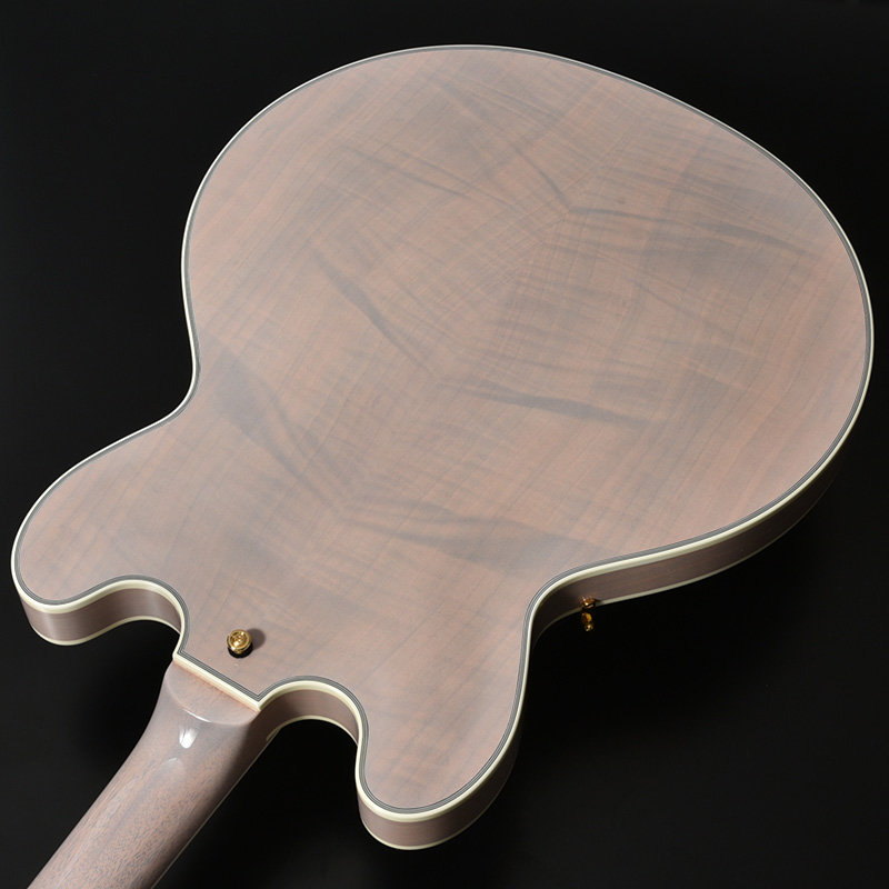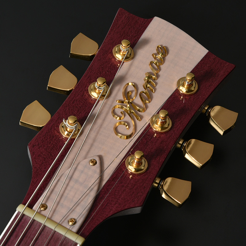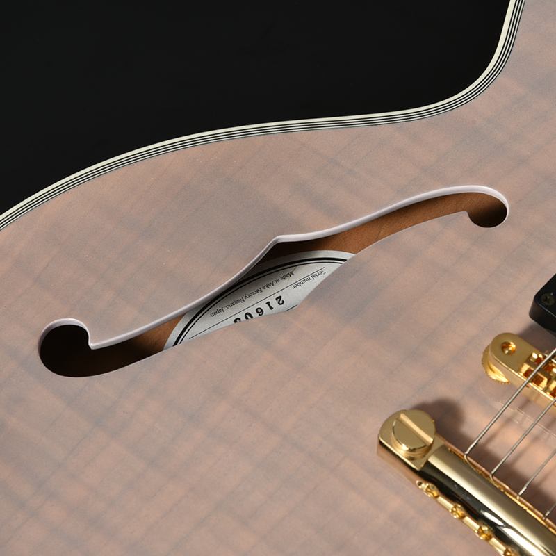 和材の中でも人気No1を誇る桜をコンセプトにした使用した、特別仕様のMESモデルです。美しいフレイム杢の現れた桜材をボディ全体に使用し、視覚的にもサウンド面にも桜の魅力を詰め込みました。木材としては程よい硬さを持つことで知られる桜材。その甘くメロウなトーンとホロウボディとの組み合わせが、和材の魅力を新たなるステージに引き上げます。