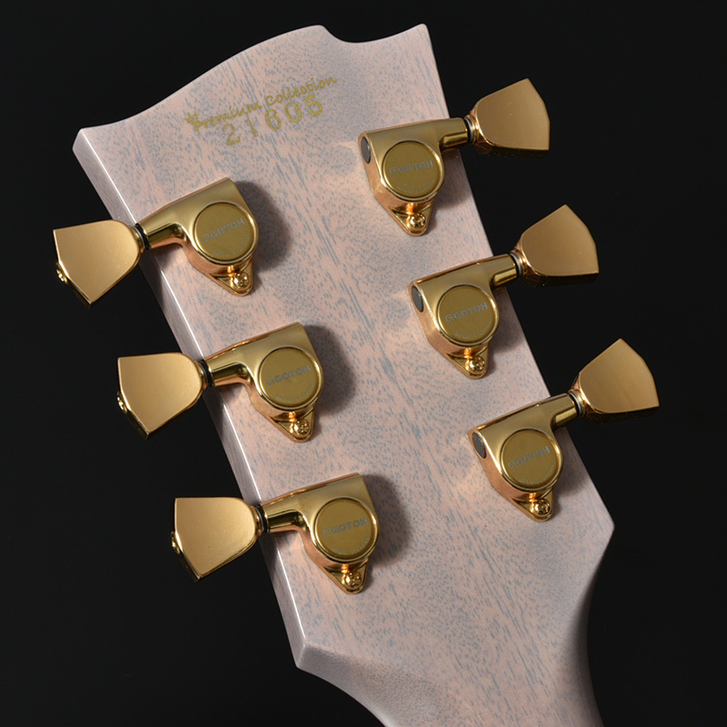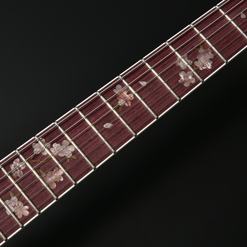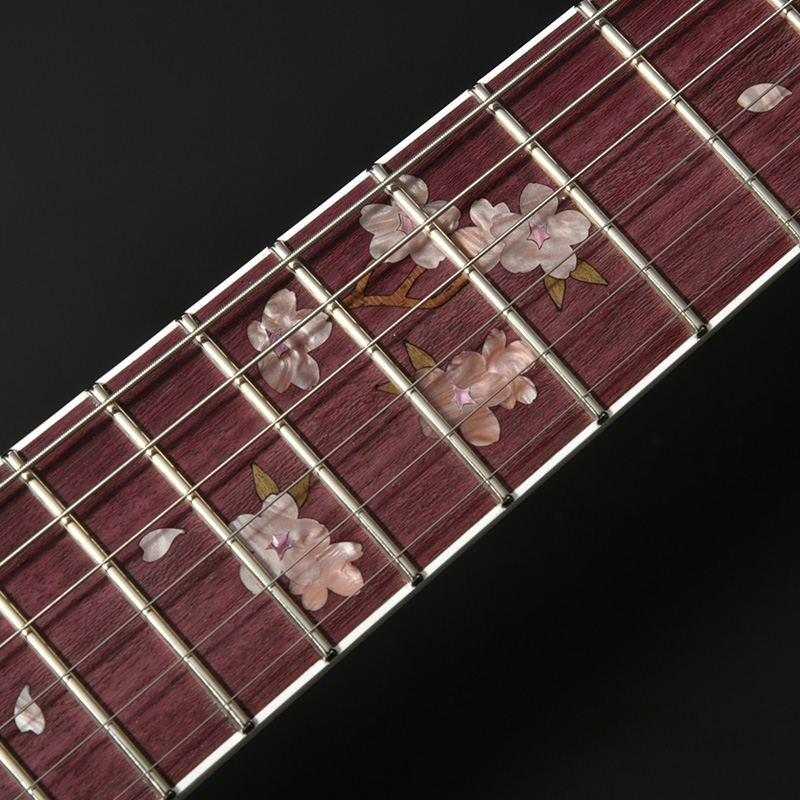 満開の桜のインレイが施された「パープルハート」は、ほんのりと紫がかった見た目が特徴の木材です。材質としては非常に硬く、ローズウッドよりもやや高音にピークを持ったブライトなサウンドを得意とします。また、ピックガードも同様にパープルハート材で製作されています。