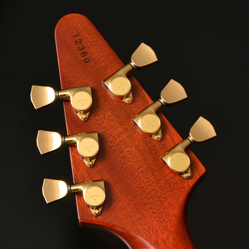 全体のルックスはMFVモデルでありながら、MLモデルの要素を組み合わせており、ストップテールピースも使ったコンビネーションブリッジ、2Vo2Toのコントロールに加えヘッドの突板などから、そのコンセプトを感じ取ることができます。カラーリングもMLモデルの要素から来るバーストカラーで仕上げられており、ボディバインディング部分は着色を施さずクリアで表現するバインディングとなっており、高級感を感じる仕上がりとなっております。