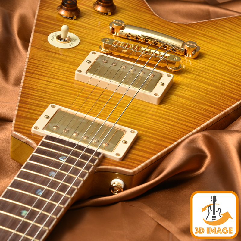 全体のルックスはMFVモデルでありながら、MLモデルの要素を組み合わせており、ストップテールピースも使ったコンビネーションブリッジ、2Vo2Toのコントロールに加えヘッドの突板などから、そのコンセプトを感じ取ることができます。カラーリングもMLモデルの要素から来るバーストカラーで仕上げられており、ボディバインディング部分は着色を施さずクリアで表現するバインディングとなっており、高級感を感じる仕上がりとなっております。