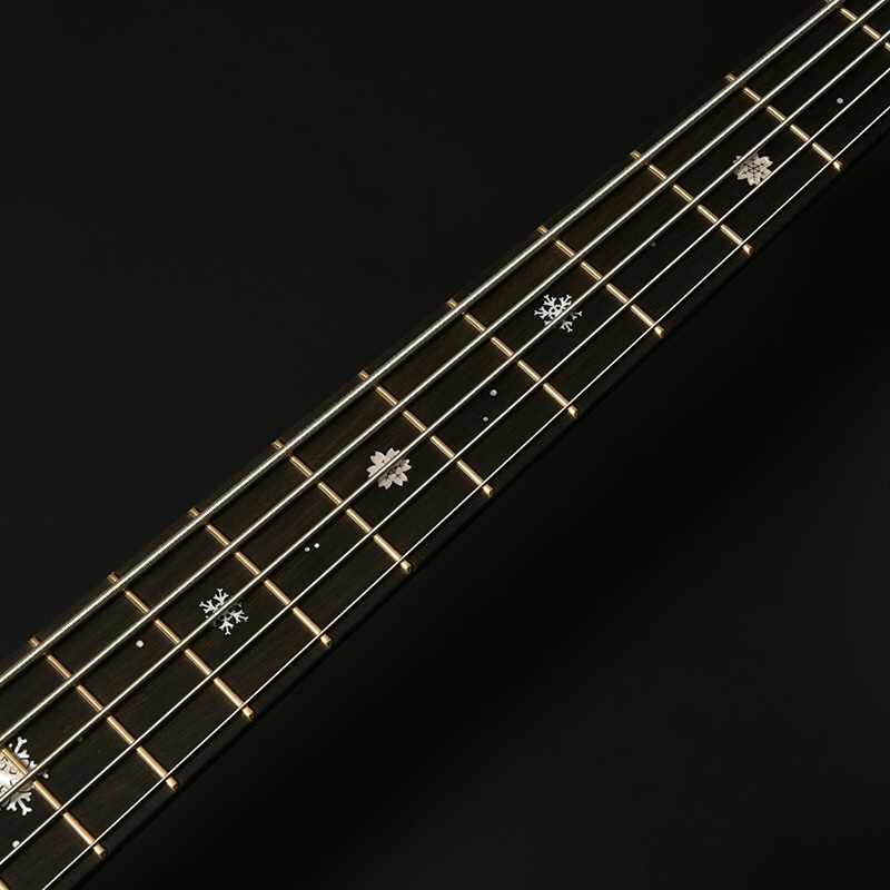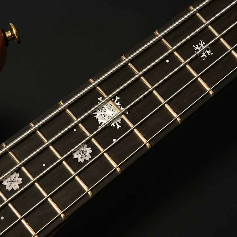 しんしんと降りゆく雪とともに、雪の結晶が繊細に描かれた指板。異なる表情を見せる結晶の中には桜をモチーフにしたインレイも施されており、桜ギターならではの個性が際立ちます。