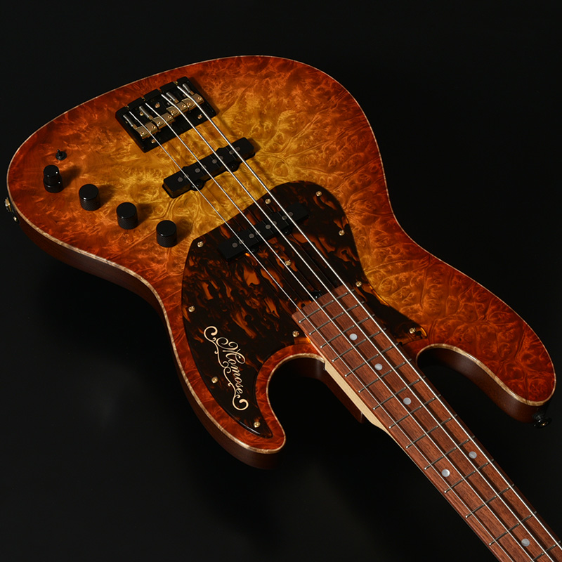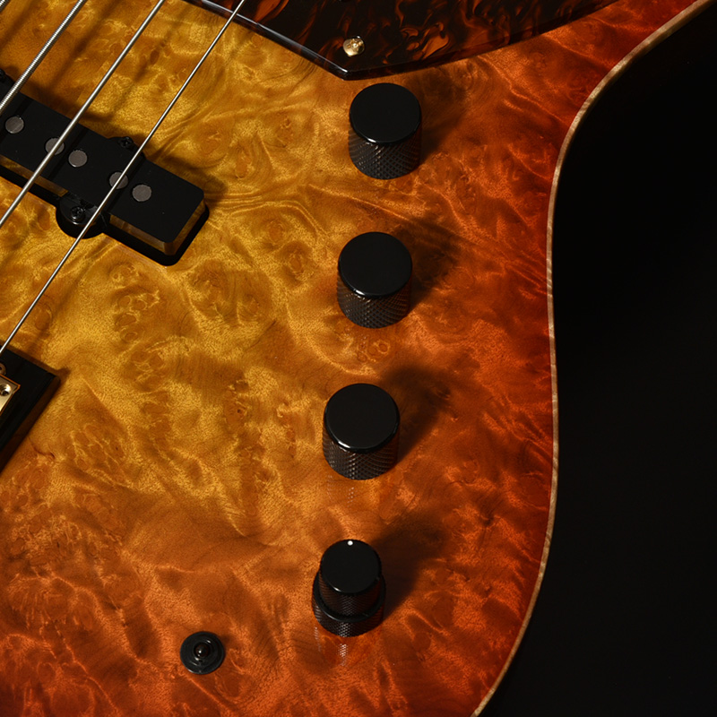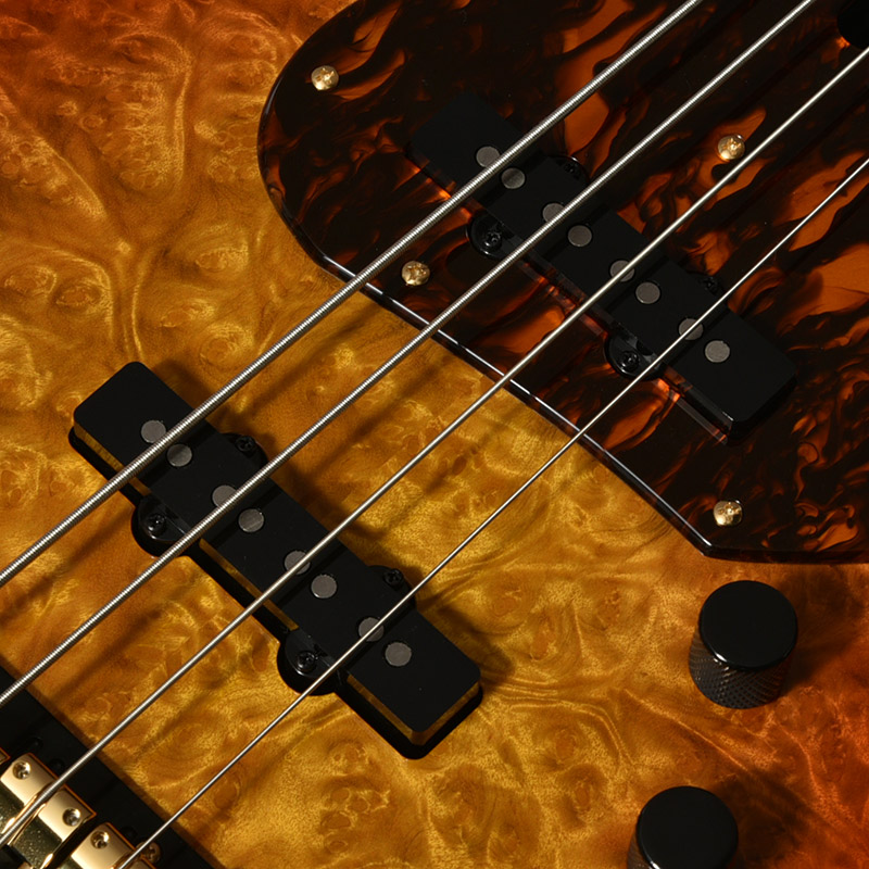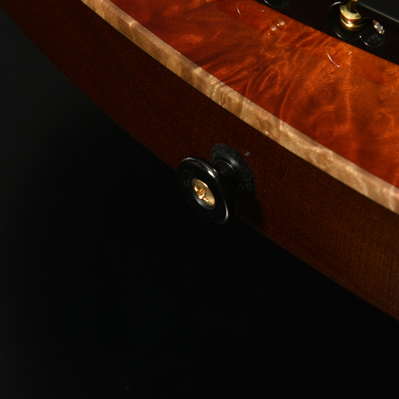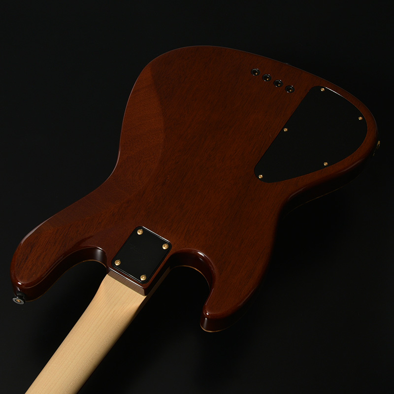 ボディトップには南米を原産とし、独特な杢目が特徴のマーブルウッドを採用。バール杢ともよく似たルックスで、抜群の存在感を放ちます。ボディ本体に使用したアフリカンマホガニーはギターとして理想の重量、硬さを併せ持つ言わずと知れた木材のひとつ。ミッドレンジの強調された粘り気のあるサウンドが魅力です。