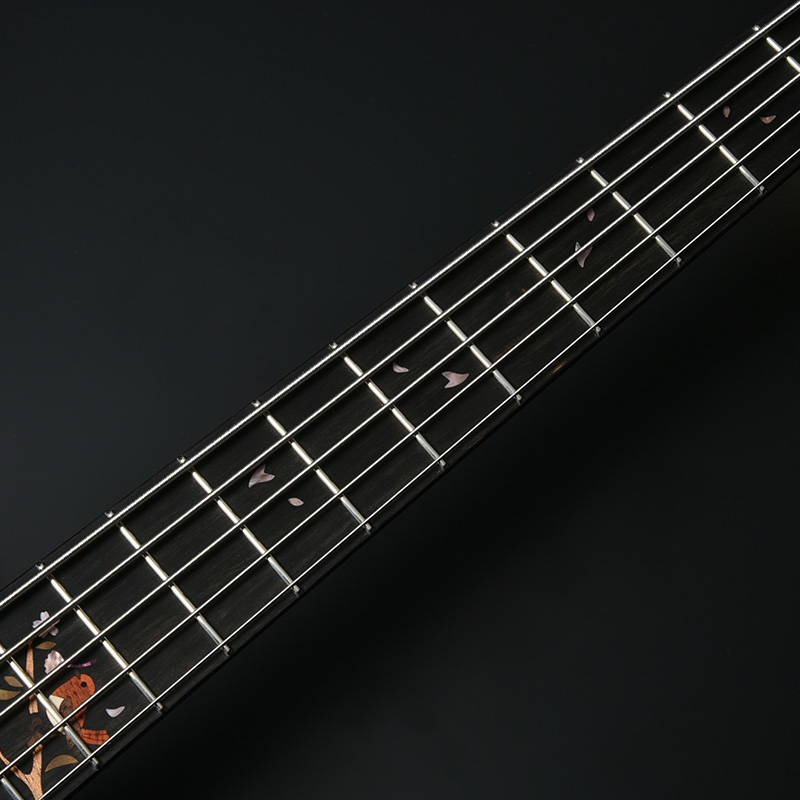 指板にも巧みなインレイワークにより、舞い落ちる桜を色彩豊かに表現。桜の枝には奈良県の県鳥であるコマドリがデザインされています。