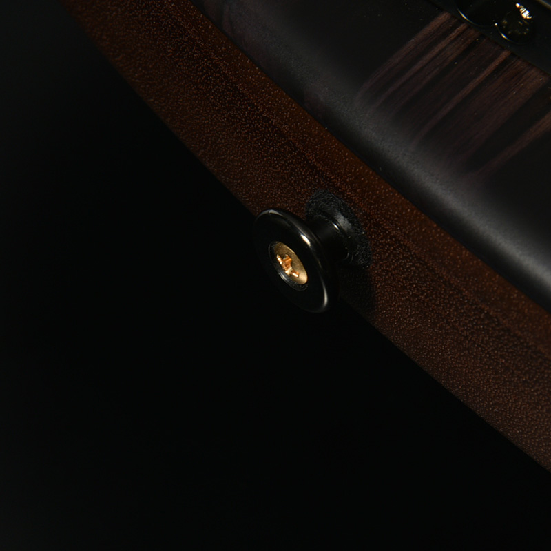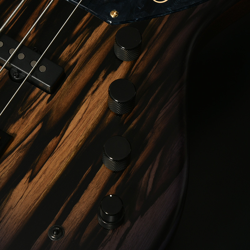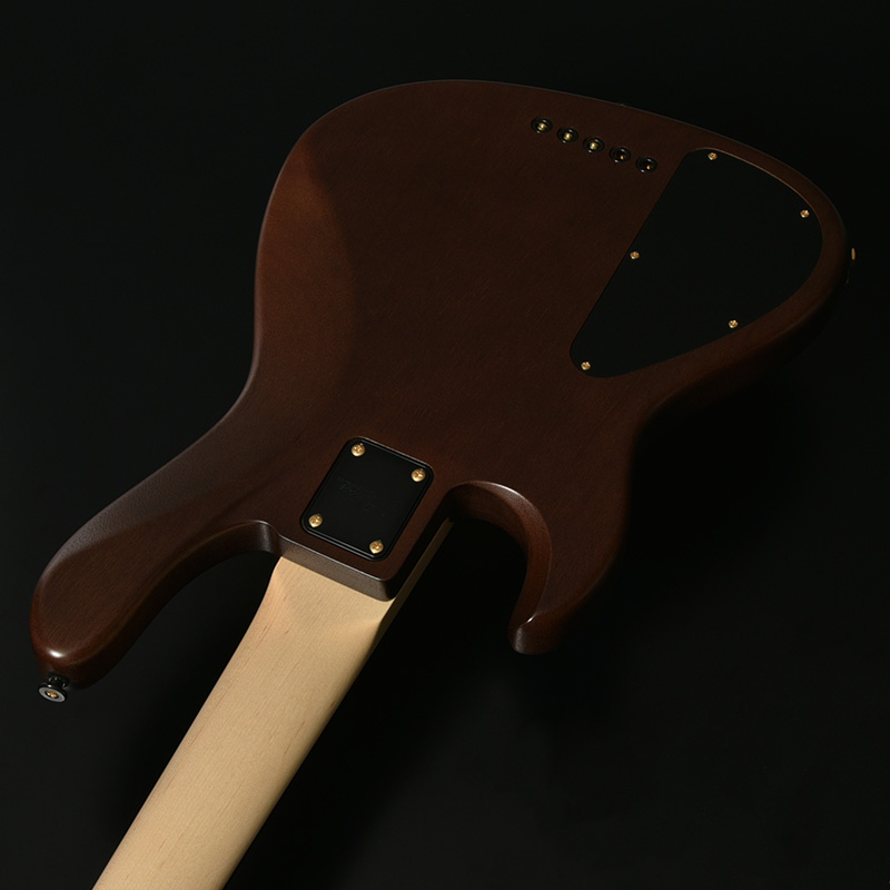 指板には黒々とした高級感のあるルックスでおなじみのエボニー材を採用。定番のローズウッドなどに比べて重量があり、立ち上がりが早く輪郭のあるトーンと伸びやかなサスティーンを生み出します。本モデルではネックのメイプル材を反りやねじれに強い「柾目(まさめ)」で製材することで、安定感抜群の演奏性と末長く愛用いただける仕様を実現しています。