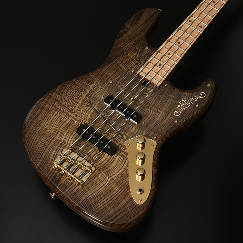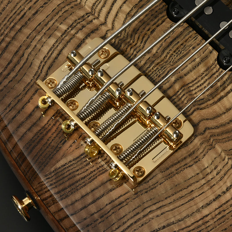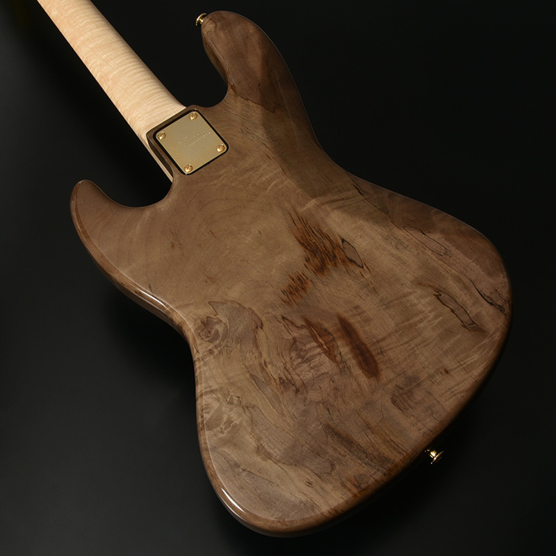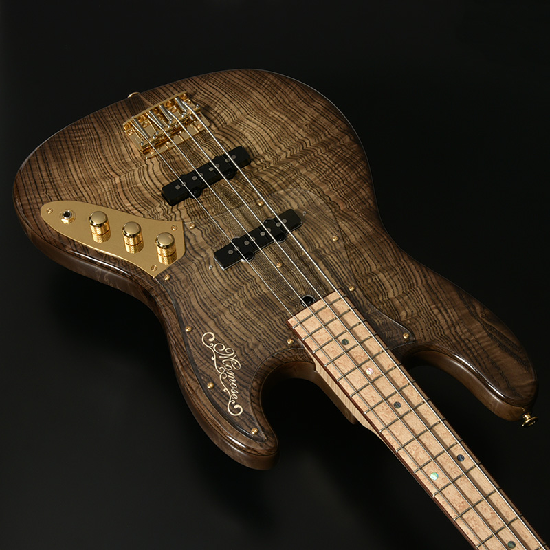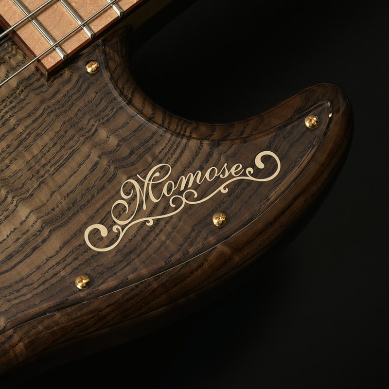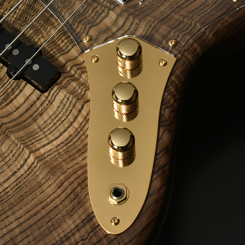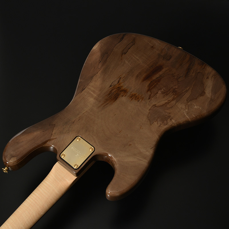 トップ材に「神代タモ」を採用したモデル。数百年~数千年以上の時を地中で過ごした埋もれ木のことを総称して「神代木」と呼び、土木工事など、地中を掘り返した時に運よく見つかることもあるといった非常に稀有な材です。遥かな時の流れの中で生まれた美しい杢目は、加工・研磨・塗装を経てギターへ生まれ変わることでいっそう輝きを放ちます。