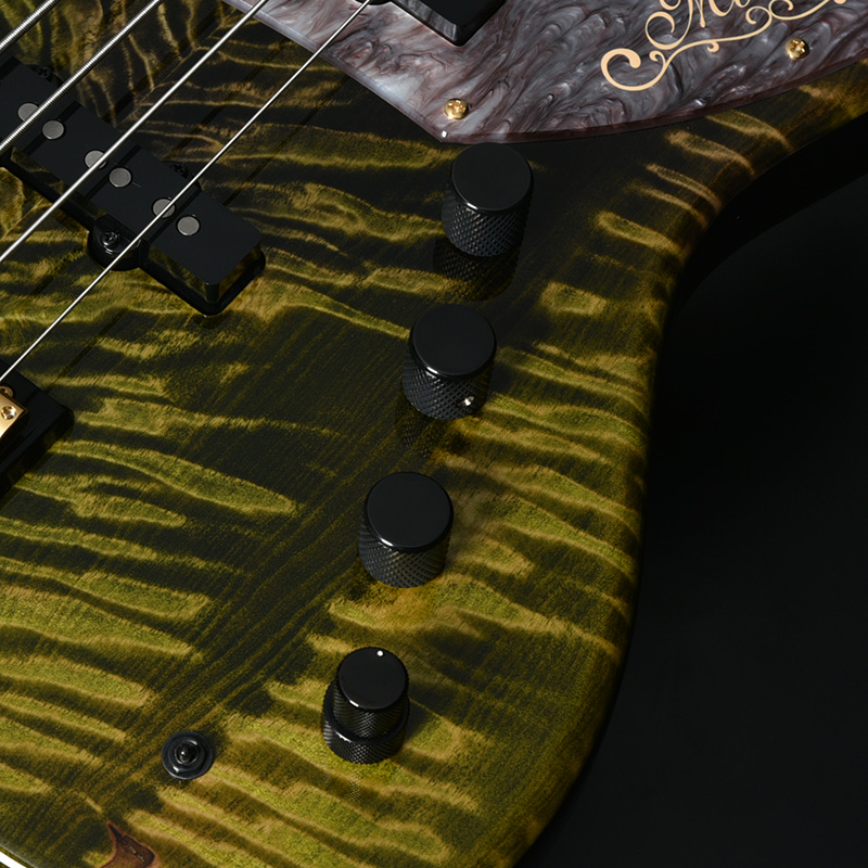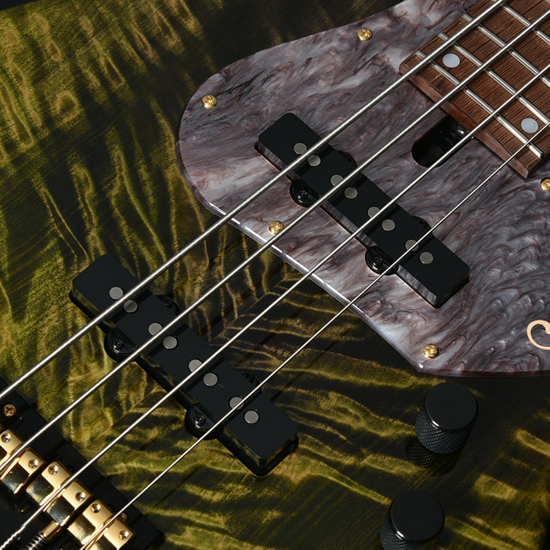 メイプル材などと比べて強度が高く、非常に硬質な特性を持つ「ウェンジ」。指板材に取り入れられることで、安定感のある抜けの良いサウンドを実現します。本モデルではネックのメイプル材を反りやねじれに強い「柾目(まさめ)」で製材することで、安定感抜群の演奏性と末長く愛用いただける仕様を実現しています。