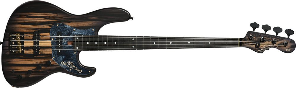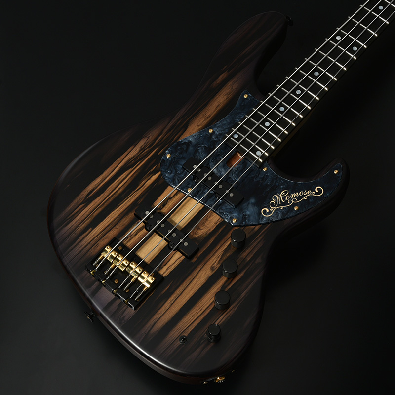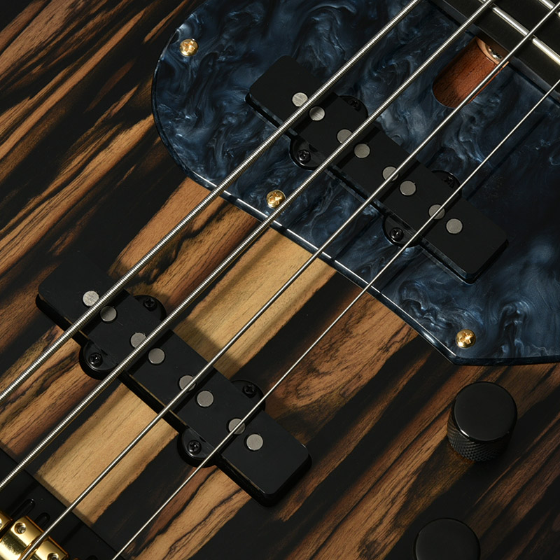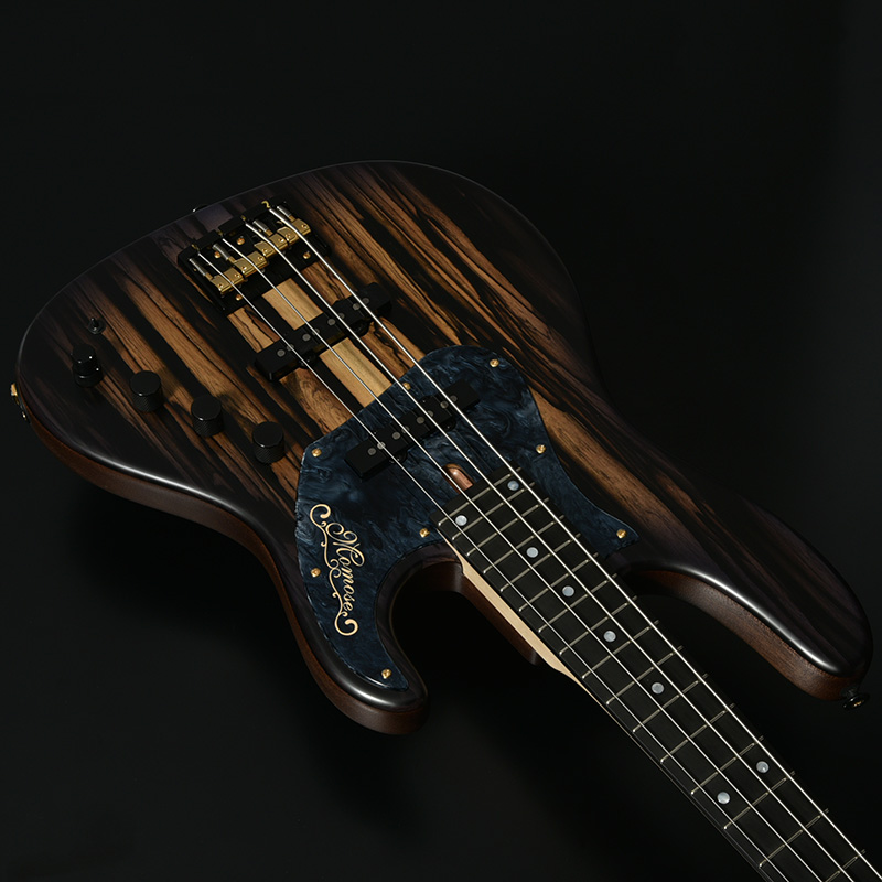 別名「ブラック&ホワイトエボニー」として知られる、和材の黒柿と似た白黒模様の杢目が特徴的な「ペールムーンエボニー」をボディトップに使用した1本。ボディ本体に使用したアフリカンマホガニーはギターとして理想の重量、硬さを併せ持つ言わずと知れた木材のひとつ。ミッドレンジの強調された粘り気のあるサウンドが魅力です。