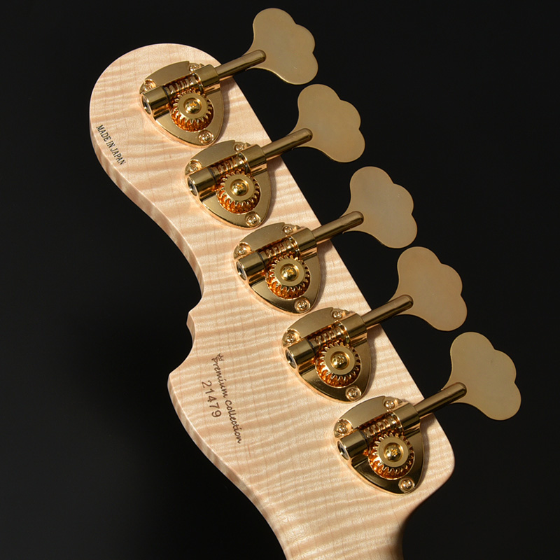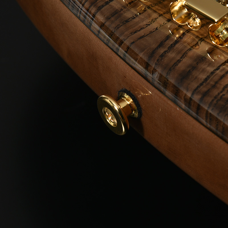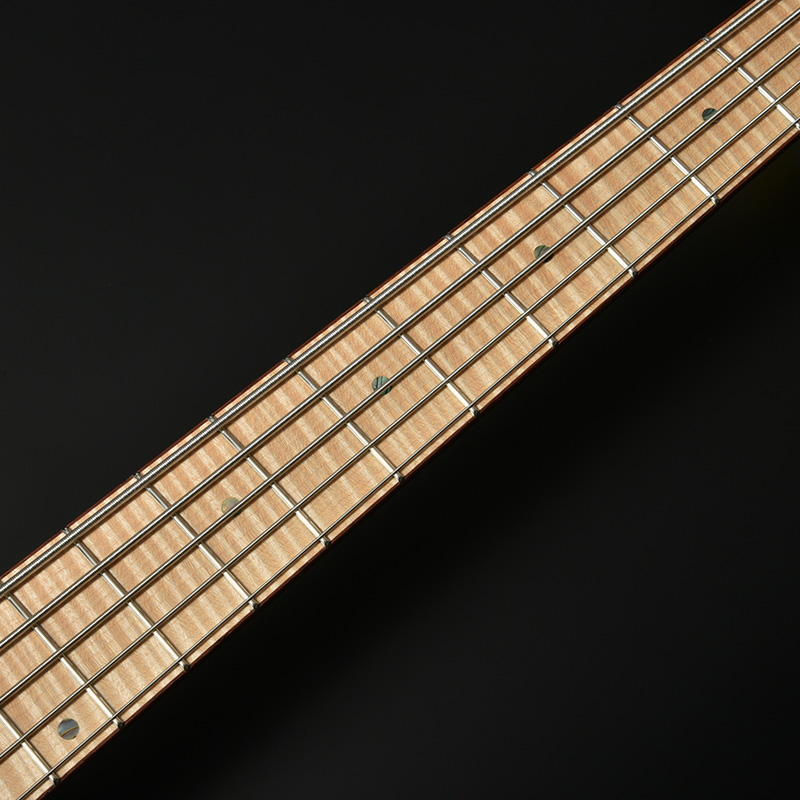 指板とネック材にはネック裏はもちろん、ヘッドストックの先端までストライプの入ったハイグレードのフレイムメイプルを選定。芸術的なルックスをぜひその目でお確かめください。