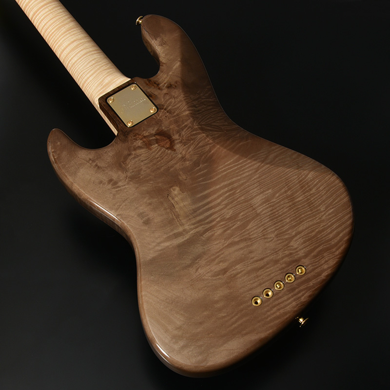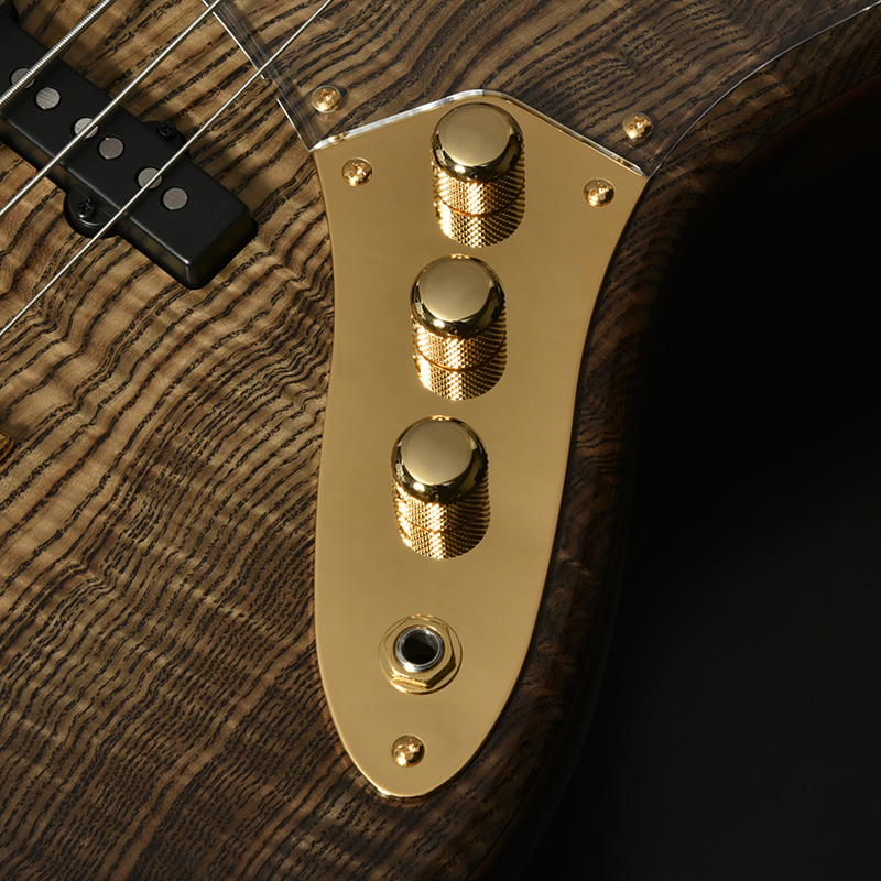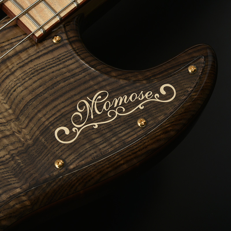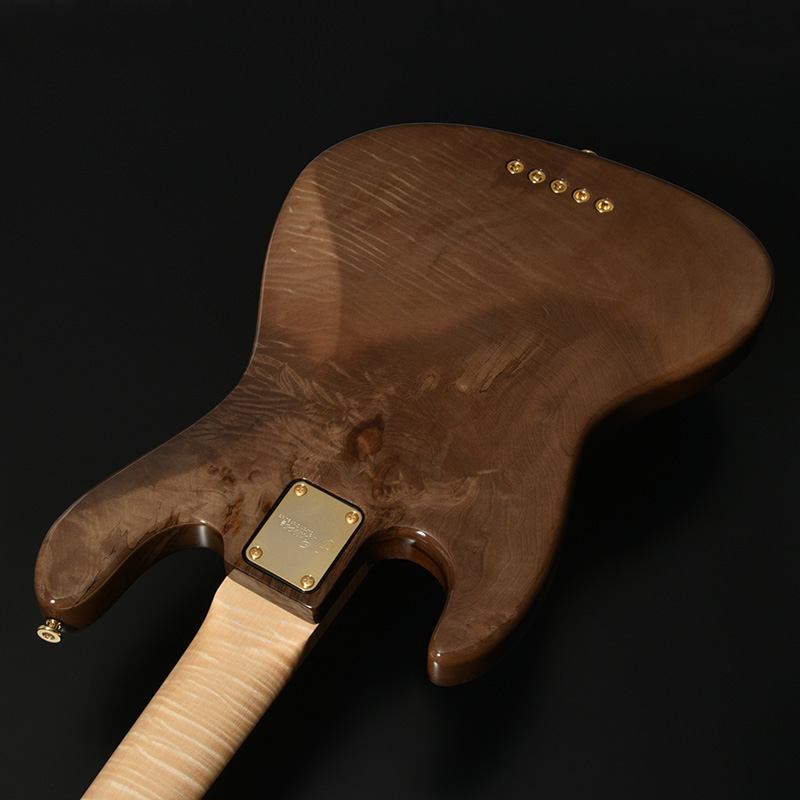 トップ材に「神代タモ」を採用したモデル。数百年~数千年以上の時を地中で過ごした埋もれ木のことを総称して「神代木」と呼び、土木工事など、地中を掘り返した時に運よく見つかることもあるといった非常に稀有な材です。遥かな時の流れの中で生まれた美しい杢目は、加工・研磨・塗装を経てギターへ生まれ変わることでいっそう輝きを放ちます。