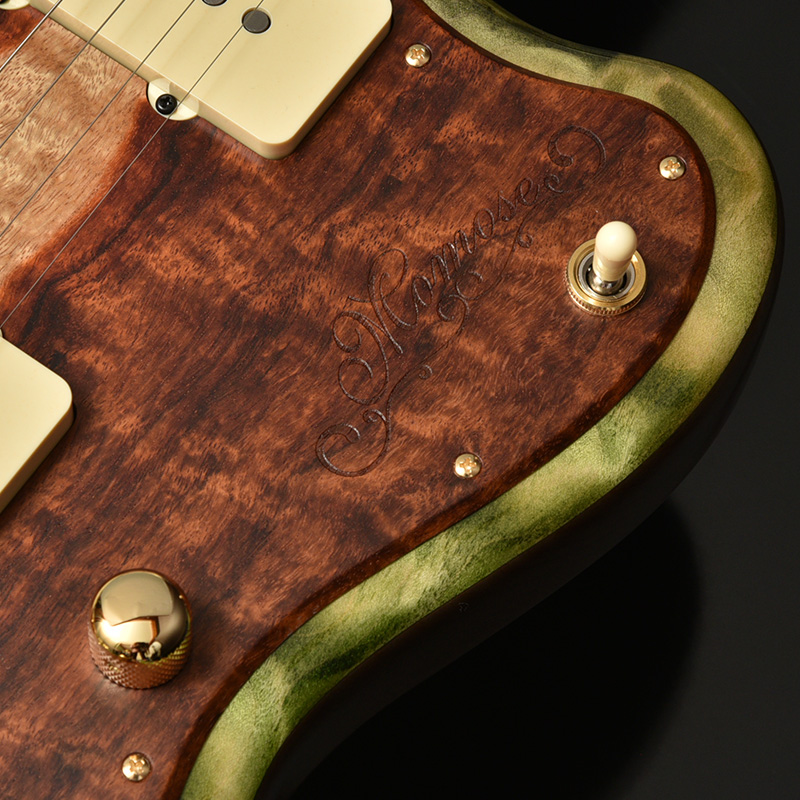 MJMスタイルのパワフルで少し暴れるサウンドを軸に、MJMスタイル定番のアッシュ材を合わせながらボディトップにメイプル材を組み合わせ、MJMスタイルらしい鳴らし応えのあるパワフルなサウンドが魅力的に仕上がりました。