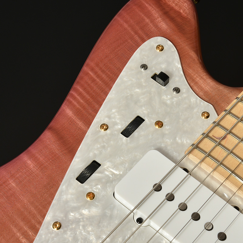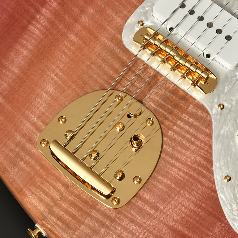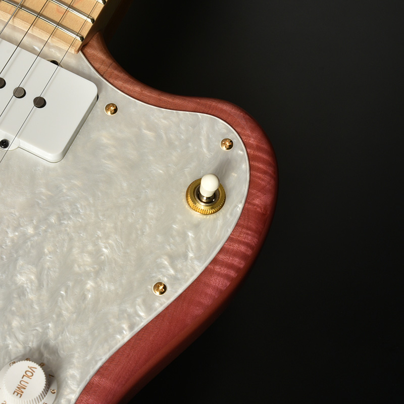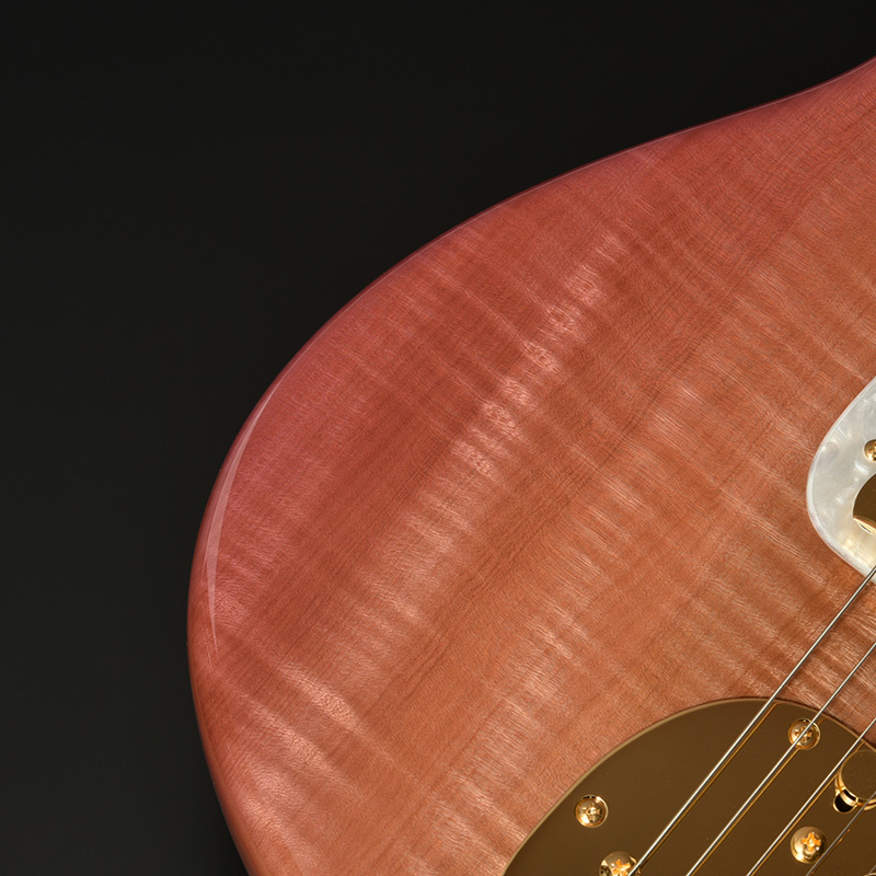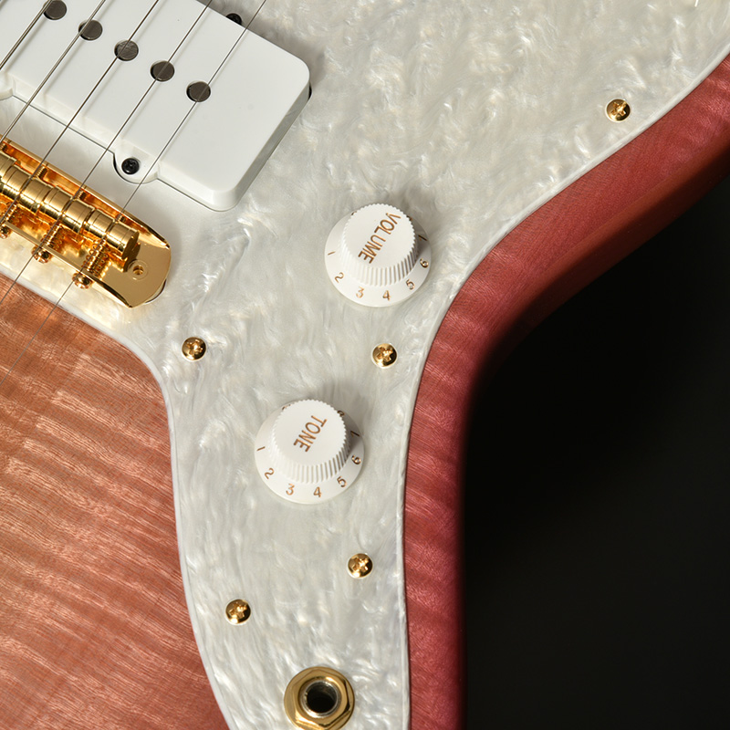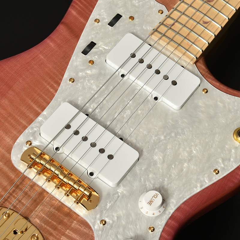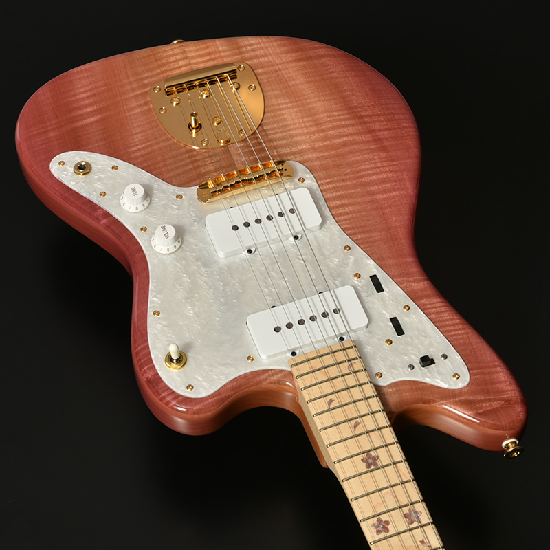 フレイム杢の出た美しい桜材をボディトップに採用した、福岡ギターショー2025限定仕様モデル。ボディ本体には定番のアルダー材を採用し、より実践的なサウンドを突き詰めました。