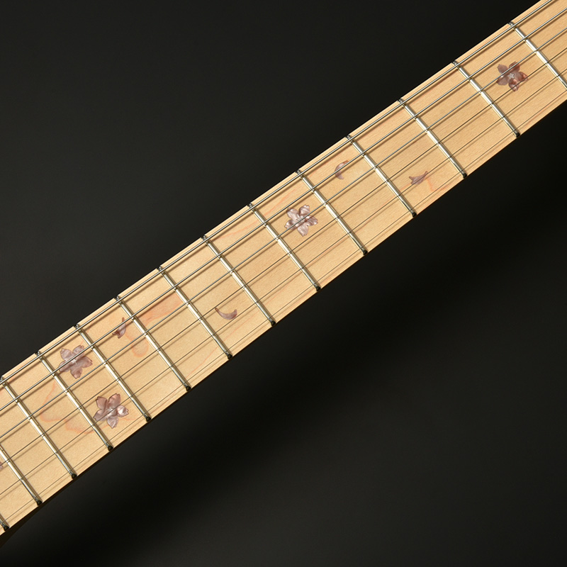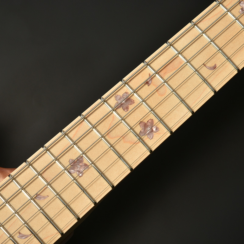 指板上のインレイには花を大きく開いた桜の花びらと散りゆく花をデザイン。天然貝が持つ色合いにより、ひとつひとつ異なる桜の表情をお楽しみいただけます。