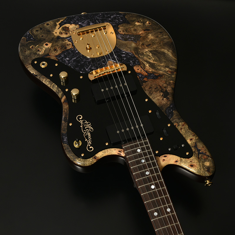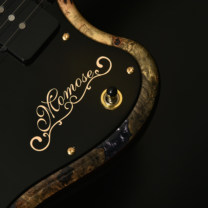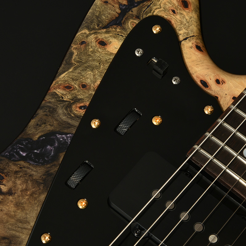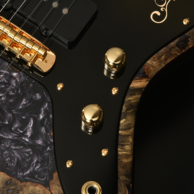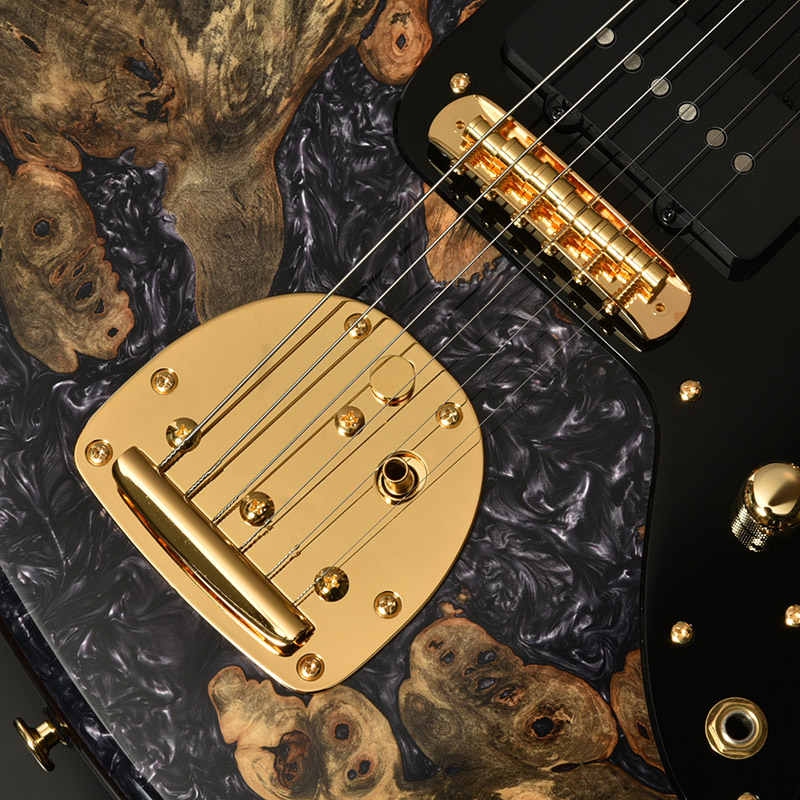 バックアイバールが自然に生み出した形を利用してレジン処理を施した、ハイブリッドモデルとも言える逸品。バール杢の魅力を最大限に引き立て、他に類を見ない独特のルックスを堪能いただける1本に仕上げました。プリセットスイッチの見直しや弦落ちしにくいブリッジサドルへの変更など、多方面からアップデートを施した”MJS”モデルです。