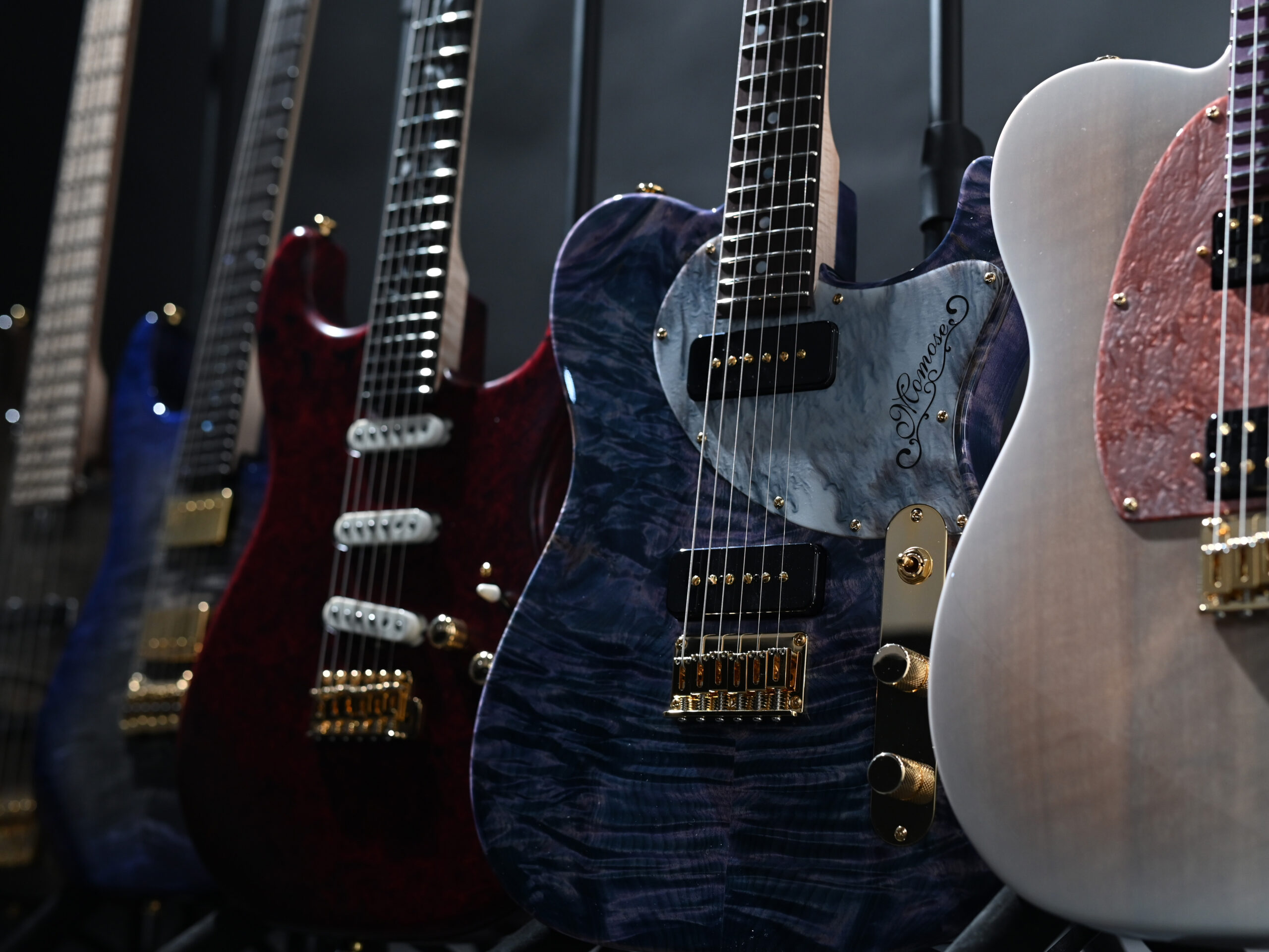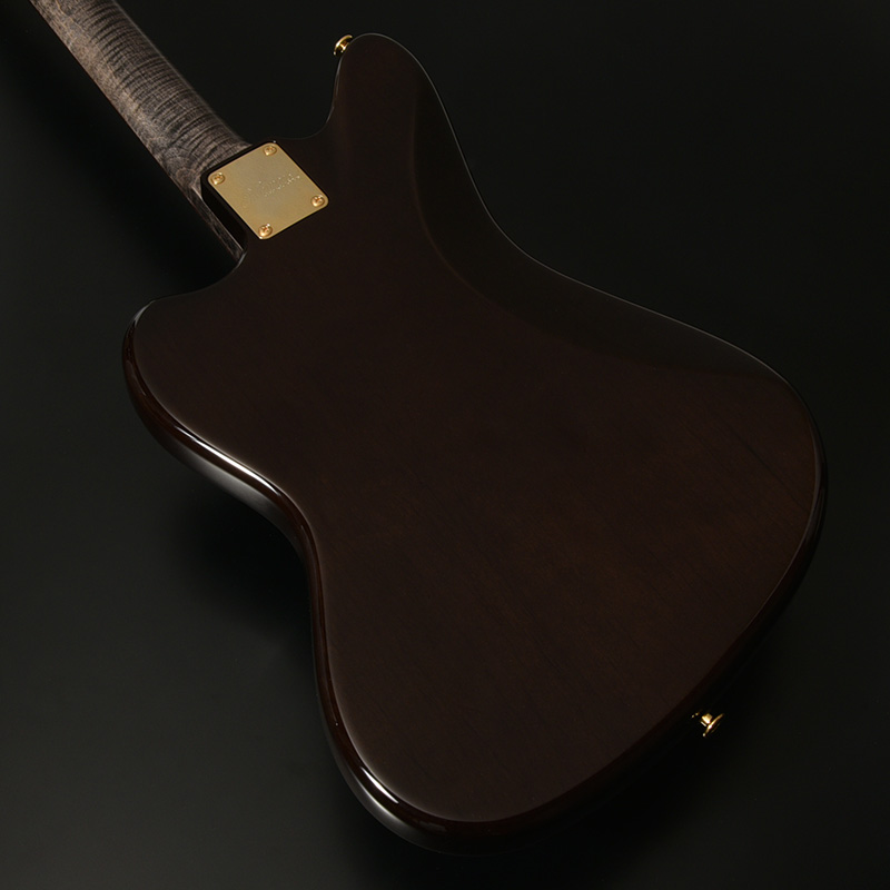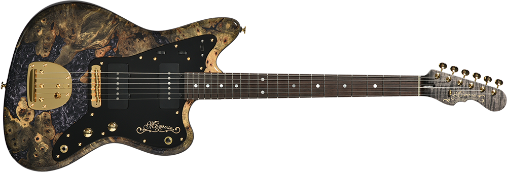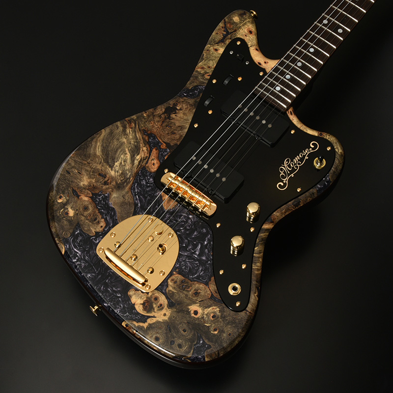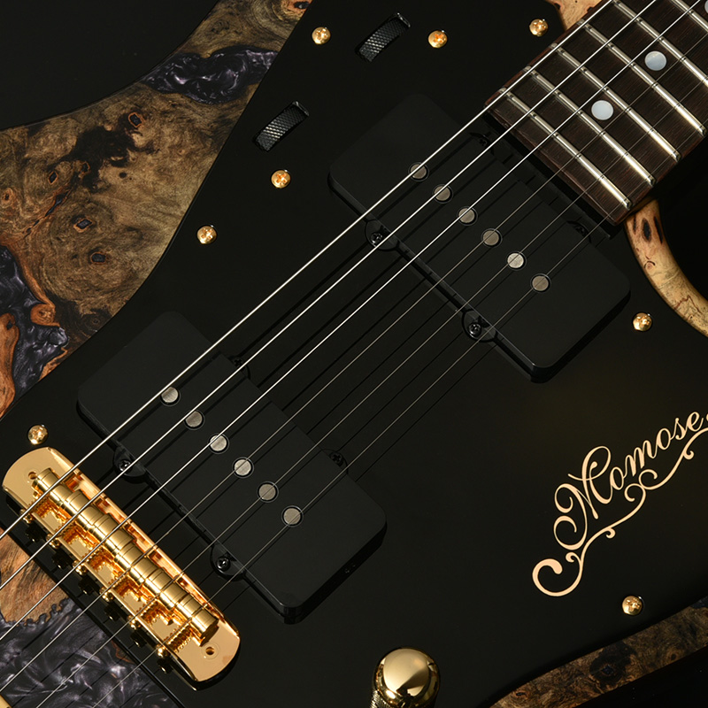 バックアイバールが自然に生み出した形を利用してレジン処理を施した、ハイブリッドモデルとも言える逸品。バール杢の魅力を最大限に引き立て、他に類を見ない独特のルックスを堪能いただける1本に仕上げました。プリセットスイッチの見直しや弦落ちしにくいブリッジサドルへの変更など、多方面からアップデートを施した”MJS”モデルです。