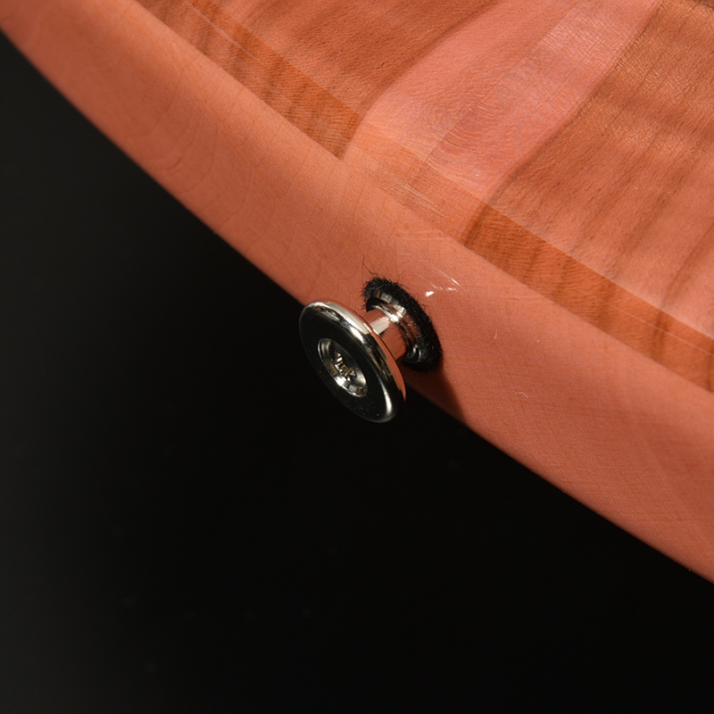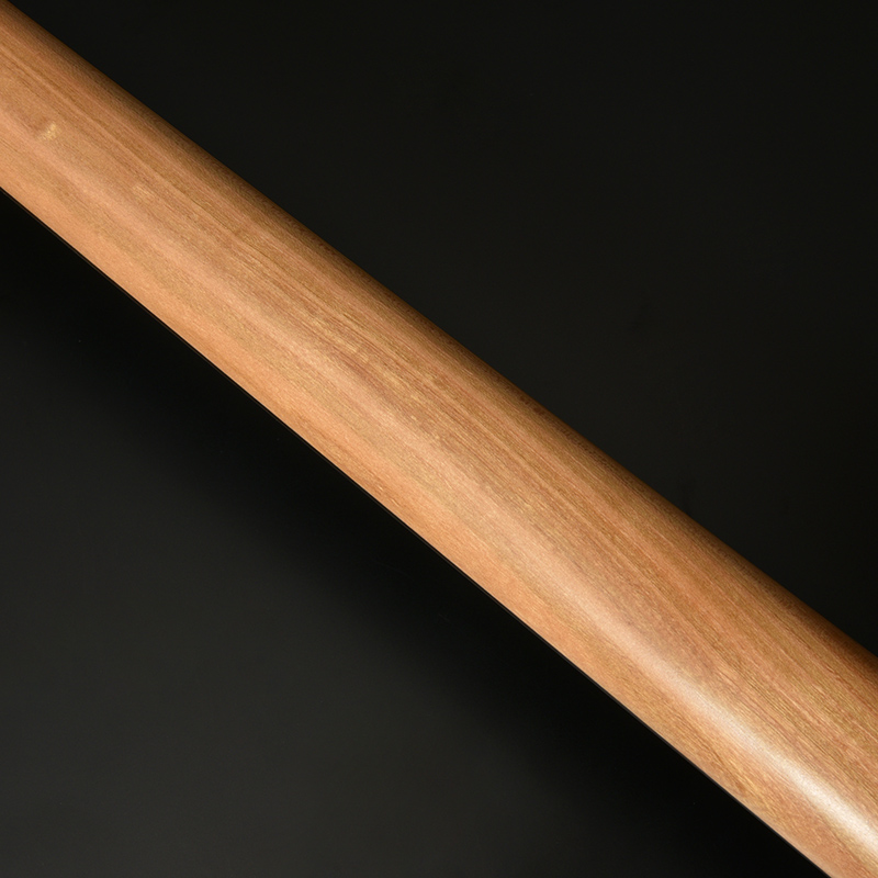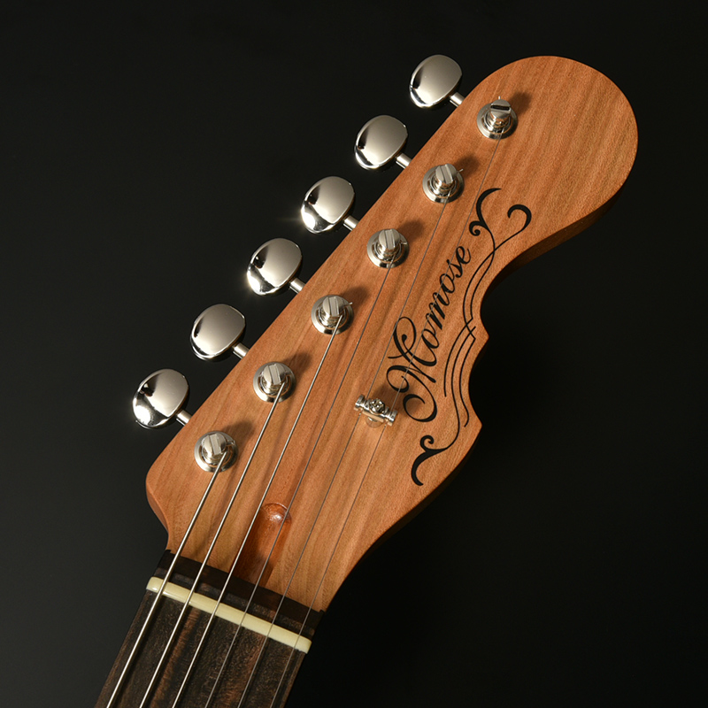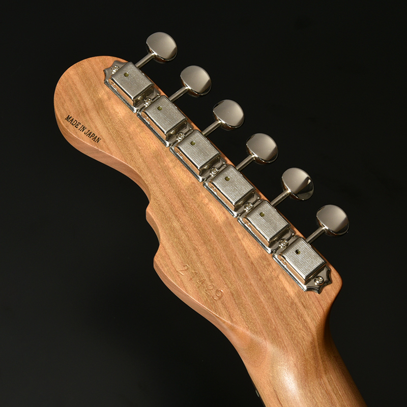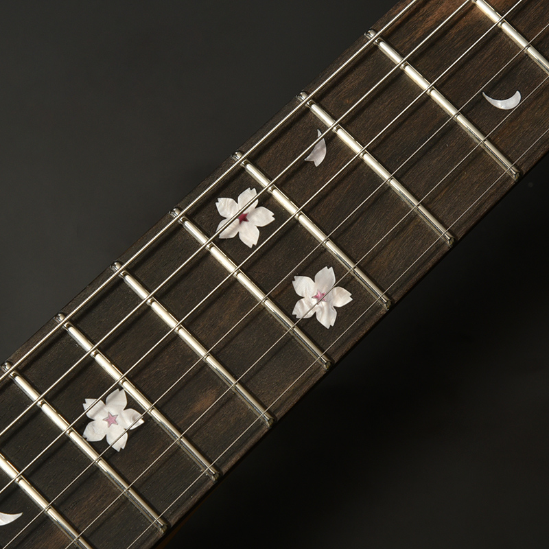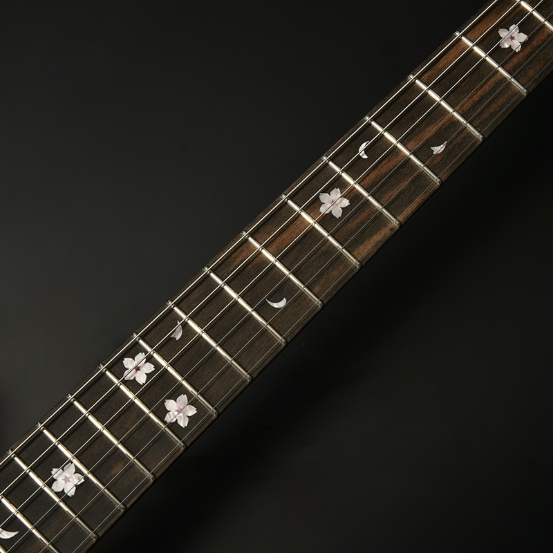 指板にはその硬さを特色とする黒柿(クロガキ)を採用。黒柿とは黒い縞模様が現れた柿の木を指し、実用性と希少性を兼ね備えた材です。ネックには同じく硬質さを材の特徴とする桜を用いており、指板の黒柿とともに日本の木材による仕様としています。