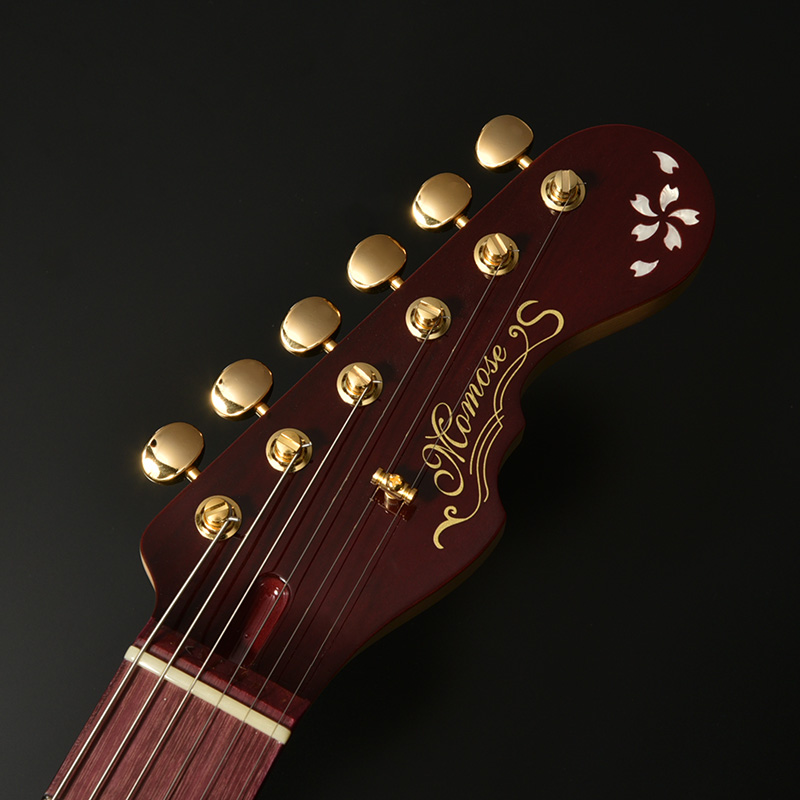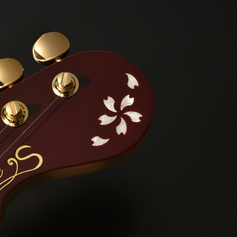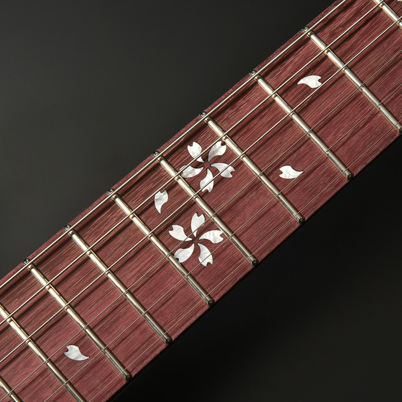 指板には桜の花びらを模したインレイを埋め込んでいます。宙にそよぐ桜の花がパープルハートの指板に表情を与え、桜モデルとしての個性を際立たせています。