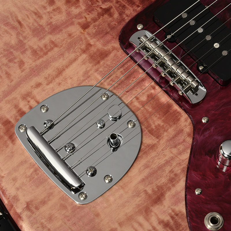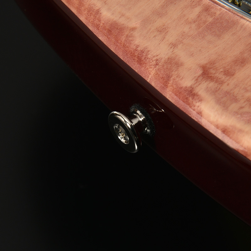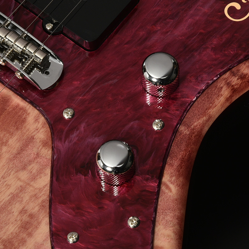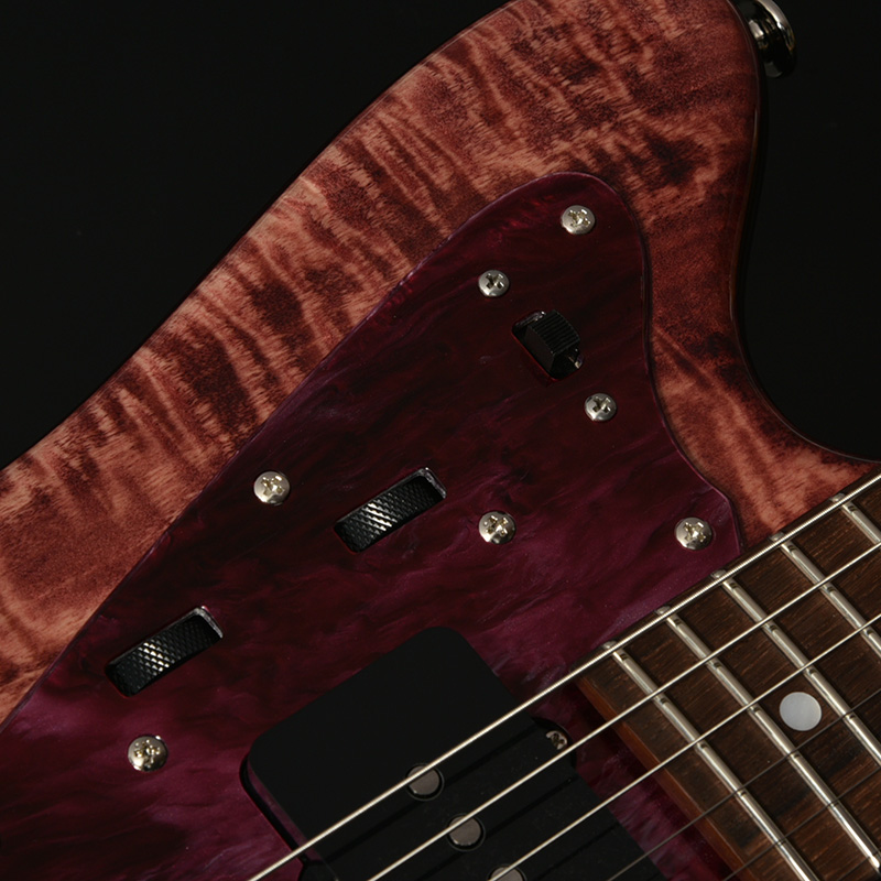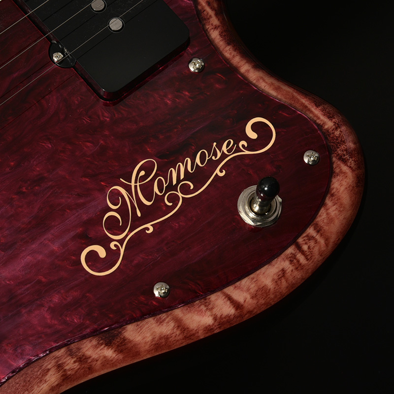 “Red Collection”に合わせて製作された本機のカラーリングは、Vintage Wine Redと名付けられました。文字通り年代物のビンテージワインを思わせる、くすみを帯びた味わい深い赤を表現しています。マッチングカラーのアクリルピックガードとの組合せにより、ギター全体を通して美しい赤の表現を目指しました。