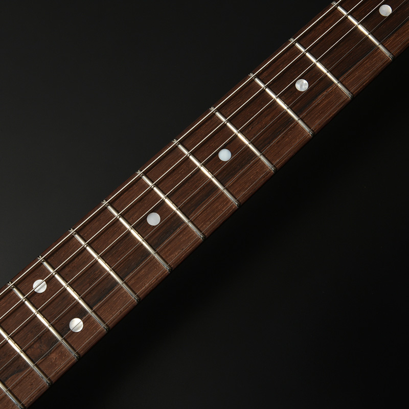 和材として人気の高いトチ材をボディに使用した一本です。トップ材には美しいフレイム杢目を有した個体を選定し、バック材にも同じくトチを採用しています。中~高音域に特徴のある抜けの良いサウンドを持ち、オーバードライブをかけた際の歪の乗りも非常に良く、その音響特性を発揮して様々なジャンルに対応可能です。