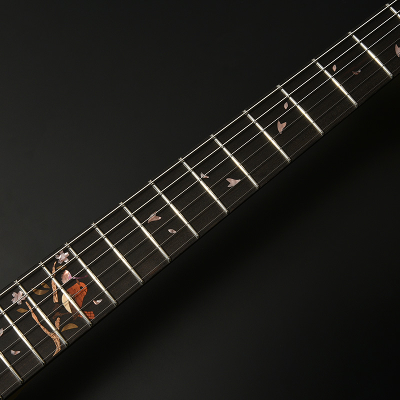 指板にも巧みなインレイワークにより、舞い落ちる桜を色彩豊かに表現。桜の枝には奈良県の県鳥であるコマドリがデザインされています。