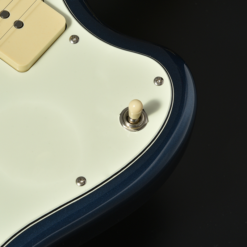 スイッチが左側の場合はシリーズ(直列)接続となり、フロントPUとリアPUが直列に繋がれ、出力が増大します。ラージサイズシングルコイルピックアップをハムバッカーのような太く粘り気のあるトーンに切り替えられるようになったことで、さらに多様なジャンルに対応できるサウンドを実現しました。