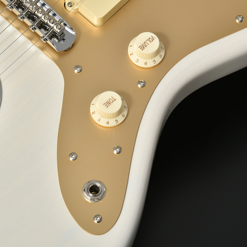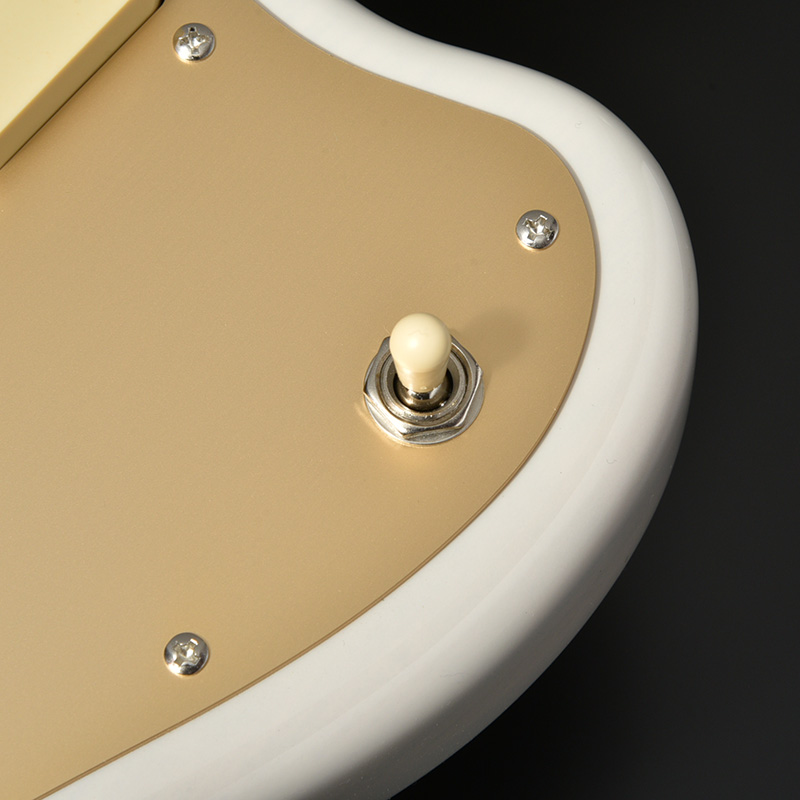 スイッチが左側の場合はシリーズ(直列)接続となり、フロントPUとリアPUが直列に繋がれ、出力が増大します。ラージサイズシングルコイルピックアップをハムバッカーのような太く粘り気のあるトーンに切り替えられるようになったことで、さらに多様なジャンルに対応できるサウンドを実現しました。
