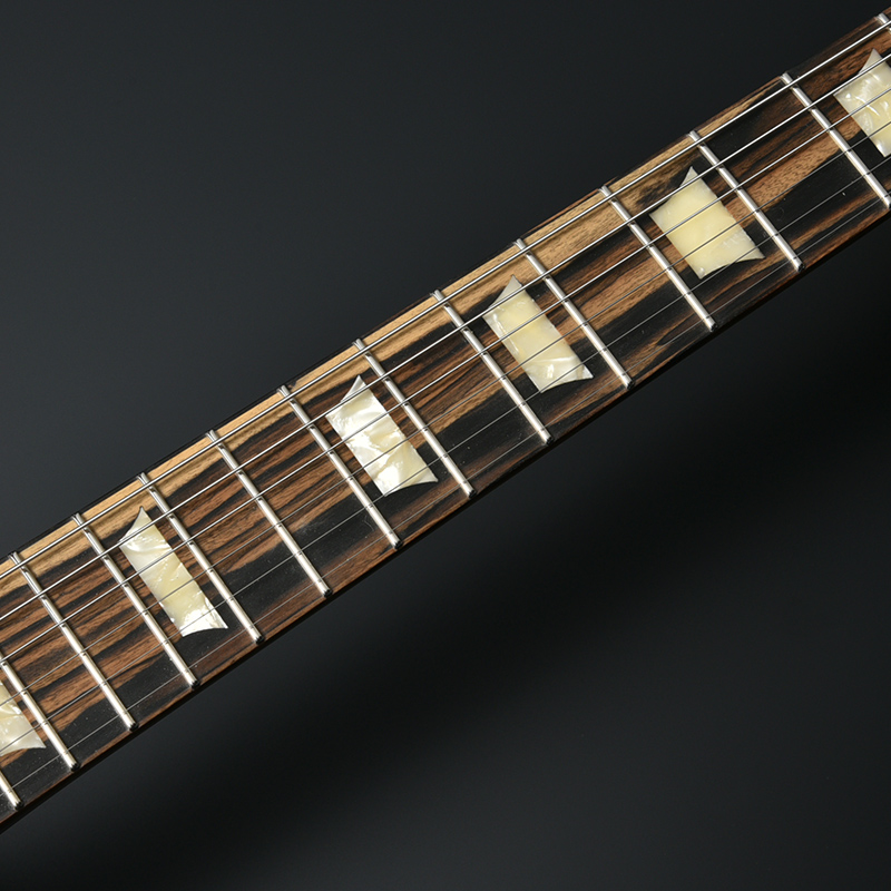指板材にはペールムーンエボニーを使用。定番のローズウッドなどに比べて重量があり、音の立ち上がりが早く輪郭のあるトーンと伸びやかなサスティーンを生み出します。