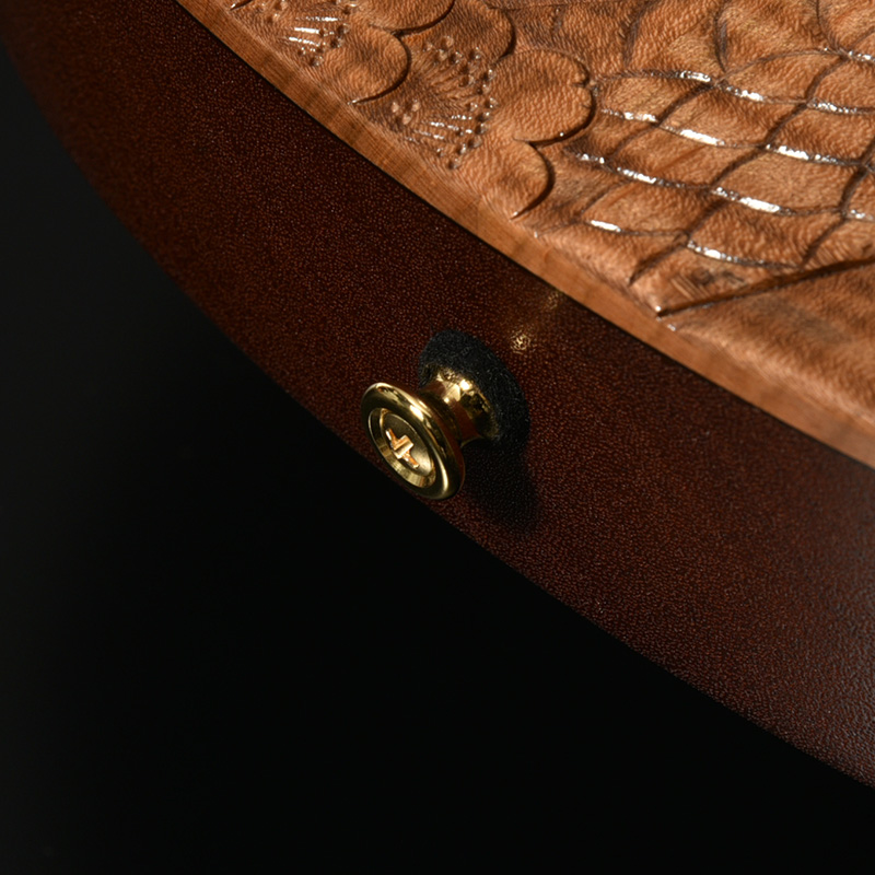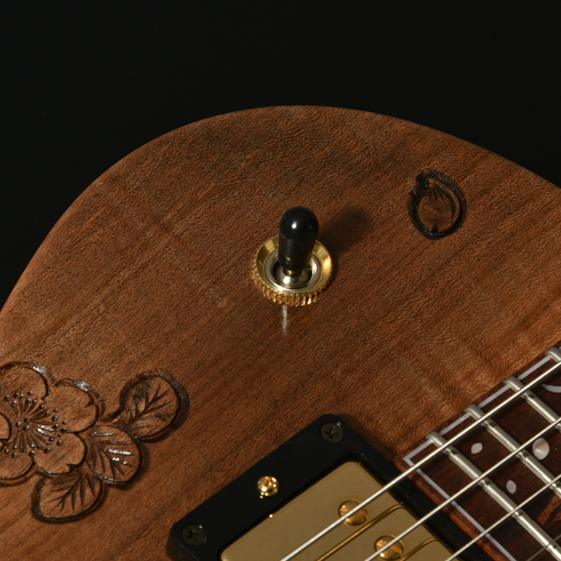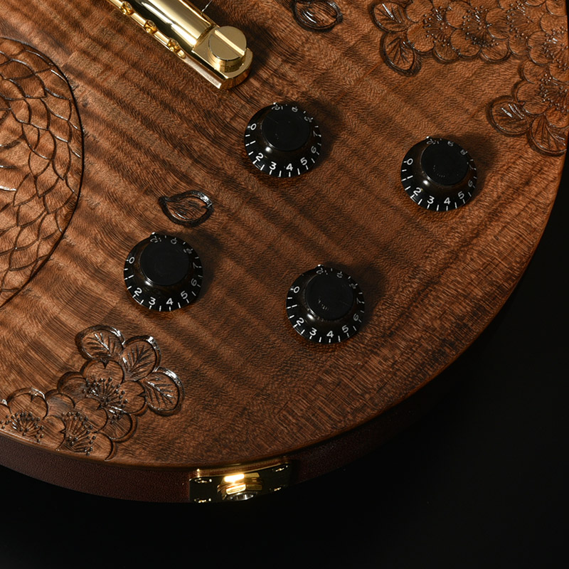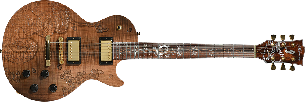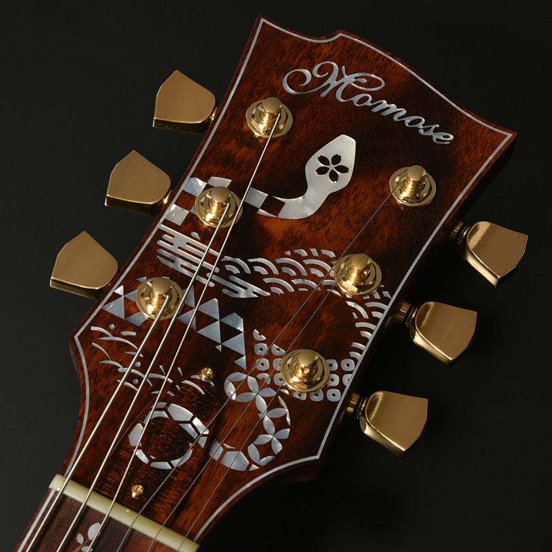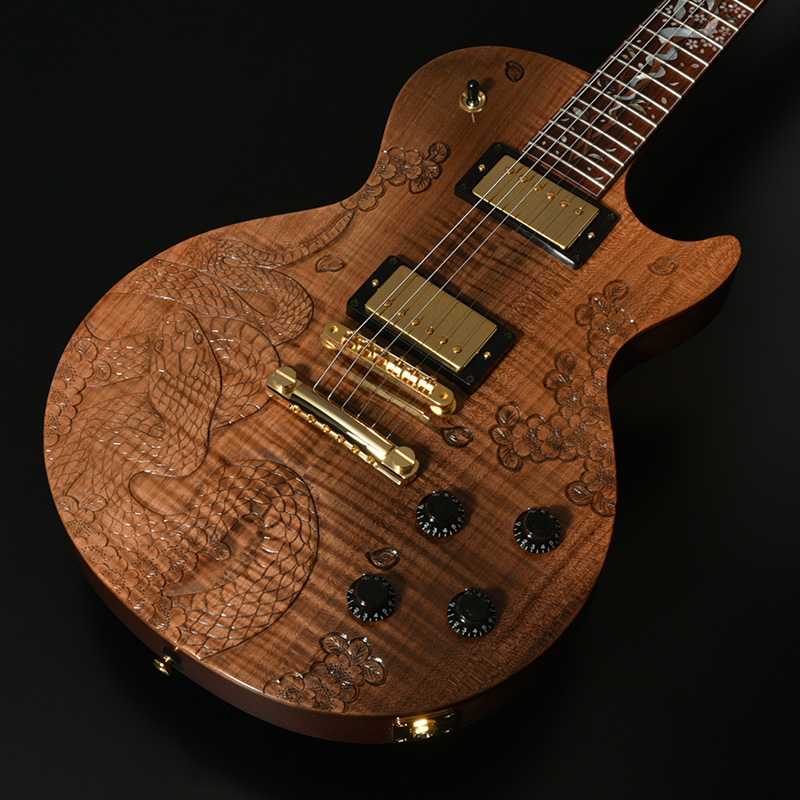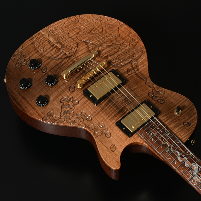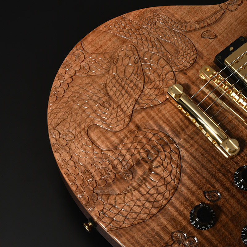 2025年の干支「蛇」と桜ギターのコンビネーションを実現させた特別な一本です。ボディトップには最高グレードのフレイム杢の現れた桜材を使用し、表面には日本が誇る伝統工芸「軽井沢彫り」が施されています。飛鳥工場の卓越したギター製造技術と、古来から受け継がれる職人技が融合した、ショーモデルにふさわしい一本が誕生しました。