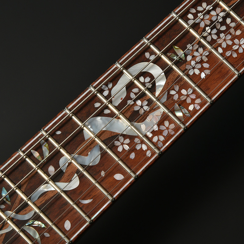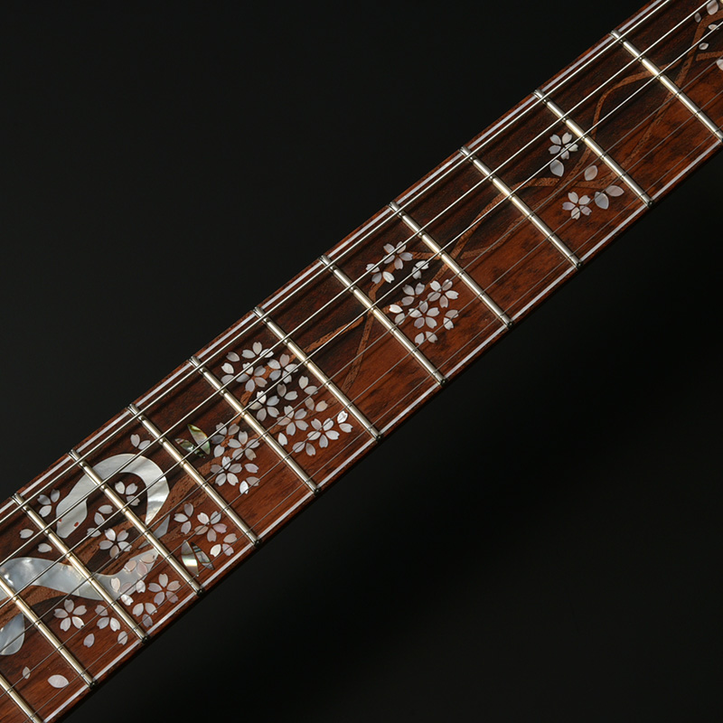 ヘッドトップにもスネークウッドが用いられ、その上に和柄を組み合わせてデザインされた蛇のインレイが施されています。天然の白蝶貝を用いることで、縁起を担ぐ白蛇を表現した特別な一本へと仕上げられました。指板上にも、桜の枝に佇む白蛇が熟練のインレイワークにより表現されています。