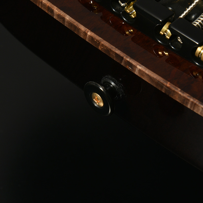 指板材にはペールムーンエボニーを使用。定番のローズウッドなどに比べて重量があり、音の立ち上がりが早く輪郭のあるトーンと伸びやかなサスティーンを生み出します。本モデルではネックのメイプル材を反りやねじれに強い「柾目(まさめ)」で製材することで、安定感抜群の演奏性と末長く愛用いただける仕様を実現しています。