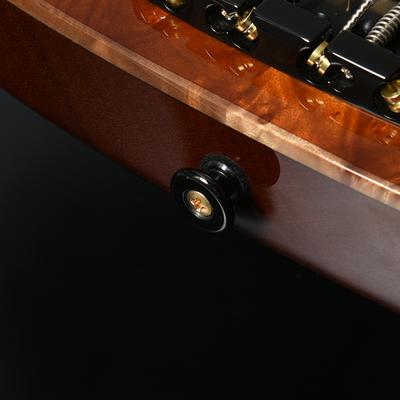 ボディトップには南米を原産とし、独特な杢目が特徴のマーブルウッドを採用。バール杢ともよく似たルックスで、抜群の存在感を放ちます。ボディ本体に使用したアフリカンマホガニーはギターとして理想の重量、硬さを併せ持つ言わずと知れた木材のひとつ。ミッドレンジの強調された粘り気のあるサウンドが魅力です。