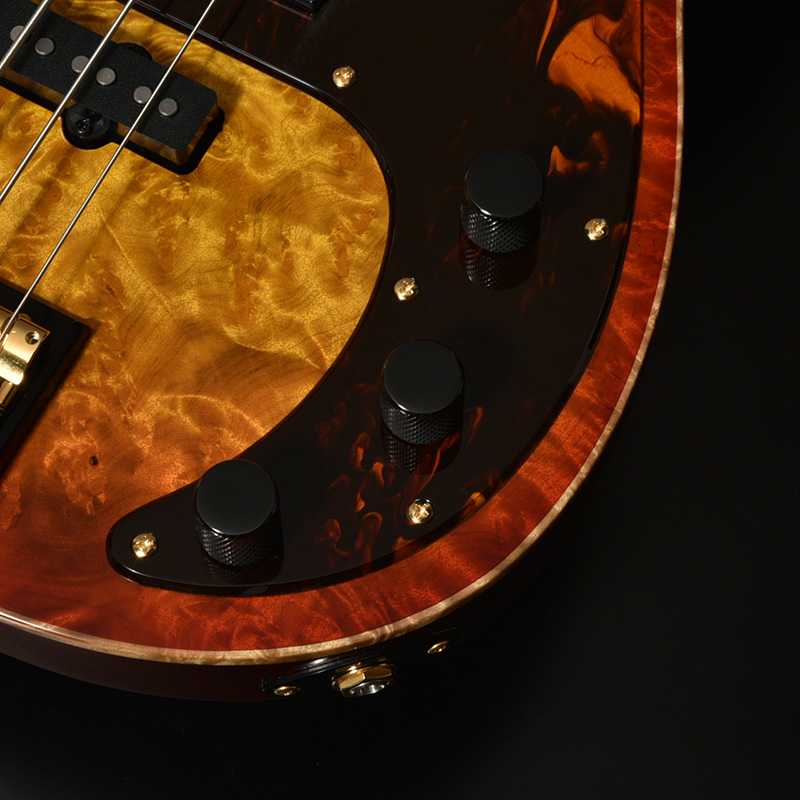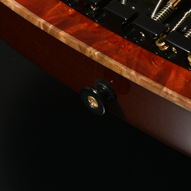 ボディトップには南米を原産とし、独特な杢目が特徴のマーブルウッドを採用。バール杢ともよく似たルックスで、抜群の存在感を放ちます。ボディ本体に使用したアフリカンマホガニーはギターとして理想の重量、硬さを併せ持つ言わずと知れた木材のひとつ。ミッドレンジの強調された粘り気のあるサウンドが魅力です。