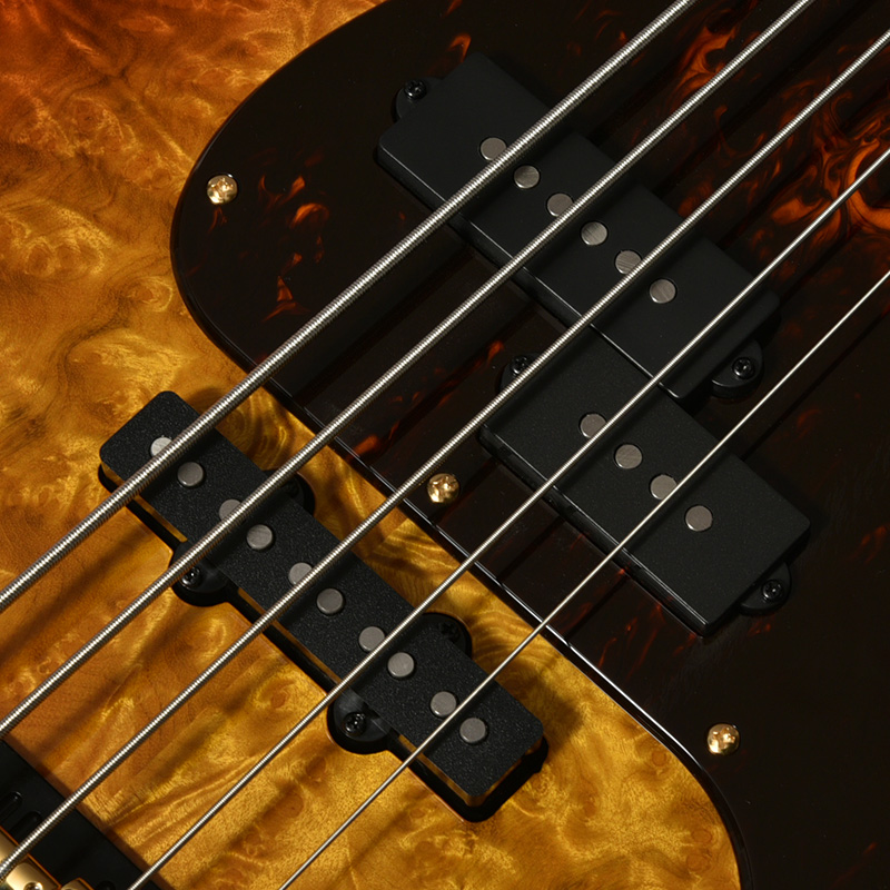 フロントポジションにはMomoseオリジナルピックアップ「VP-5」をマウントし、リアポジションにはレギュラーモデルでも使用している「VJ-5」を使用。双方アルニコ5マグネットを採用し、ブライトな高音域と厚みのある低音感を兼ね備えたベーストーンを出力します。5弦べースならではのレンジの広さと、様々なプレイスタイルに対応できるジャンルレスなサウンドをご体感ください。