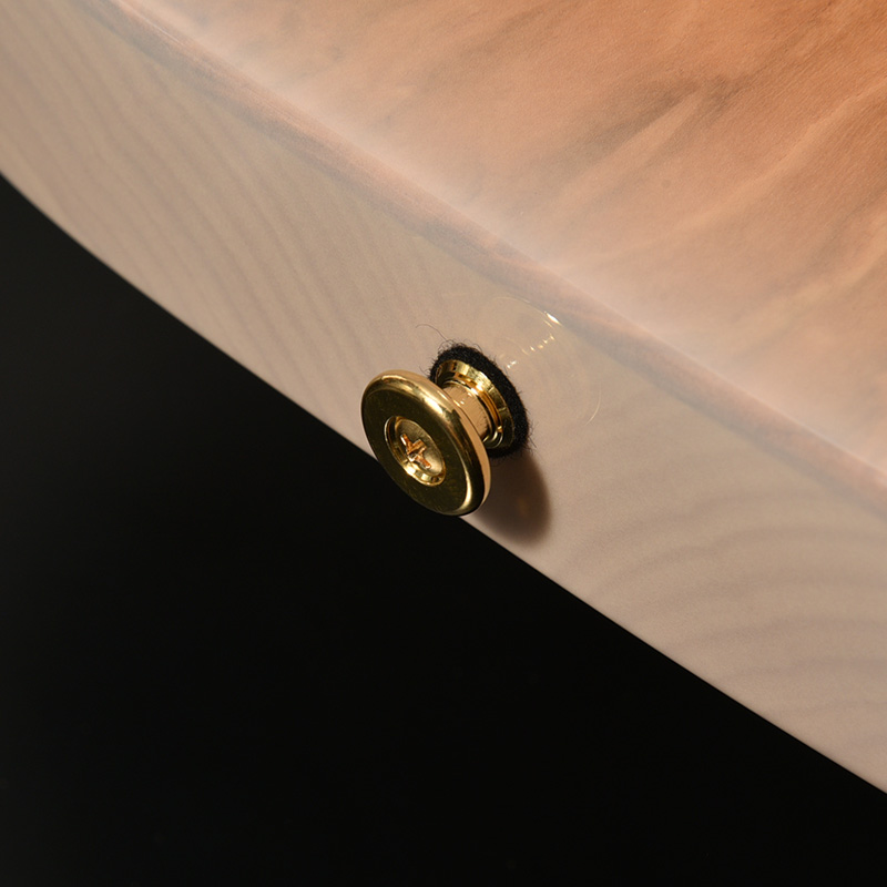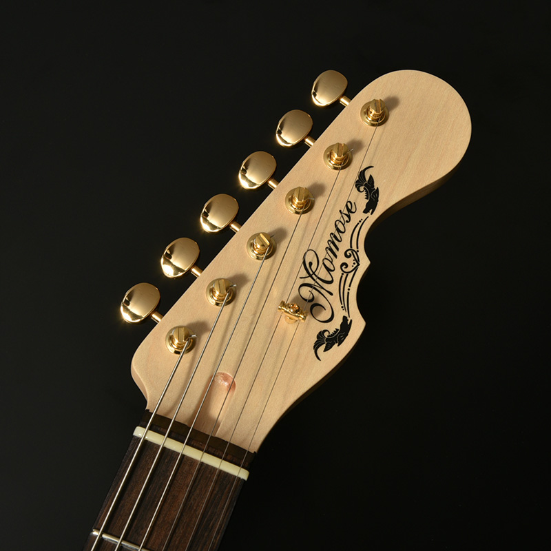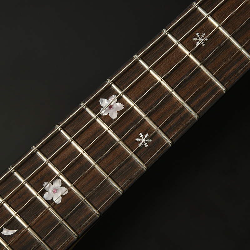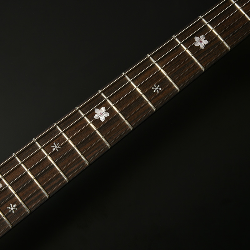 桜の花びらと雪の結晶をモチーフにしたインレイ。春と冬という異なる季節の象徴がひとつの指板上で調和し、幻想的な風景を描き出します。それぞれをポジションマークの位置に配置することで、視認性と実用性を兼ね備えたデザインとなっています。