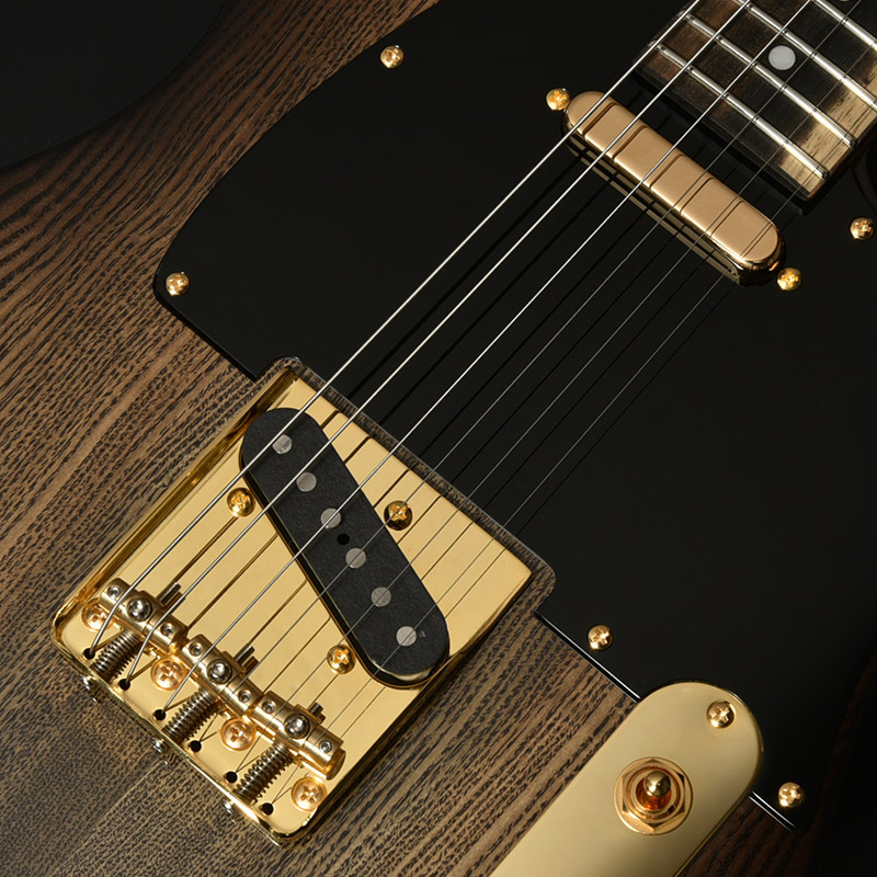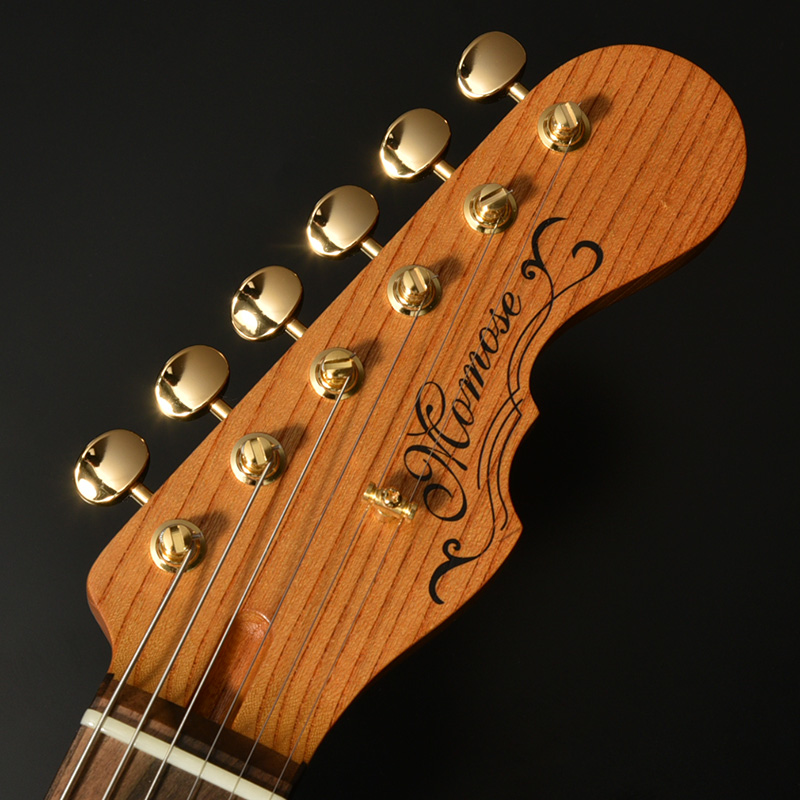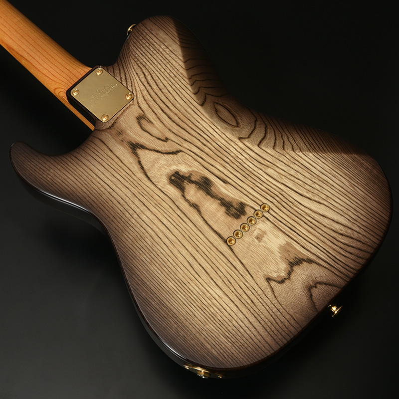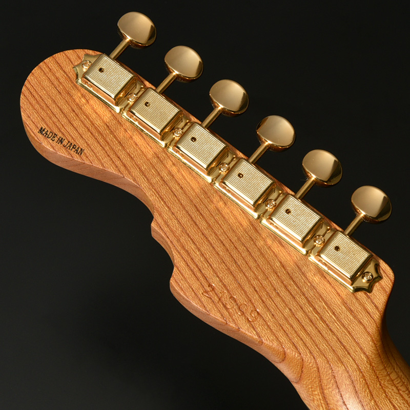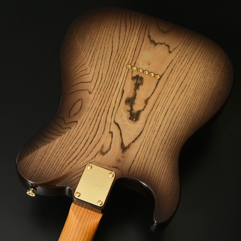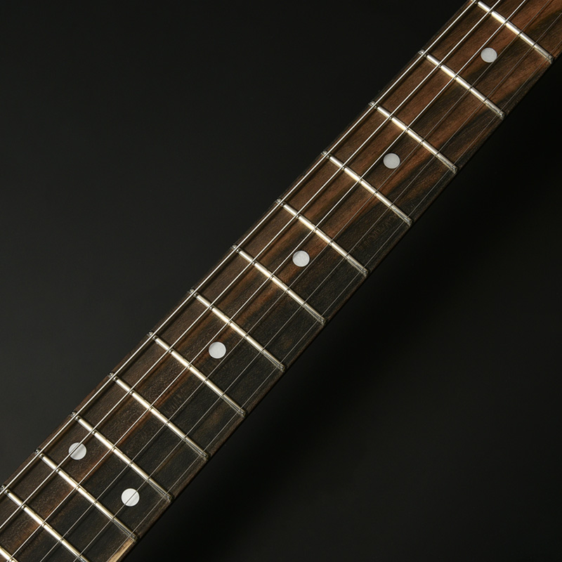 指板には、日本の銘木「黒柿(クロガキ)」を使用。黒い縞模様が現れた柿の木だけが黒柿と呼ばれ、硬質な材として知られています。ネックに用いられた欅(ケヤキ)は美しい木目と高い強度を兼ね備えた素材です。